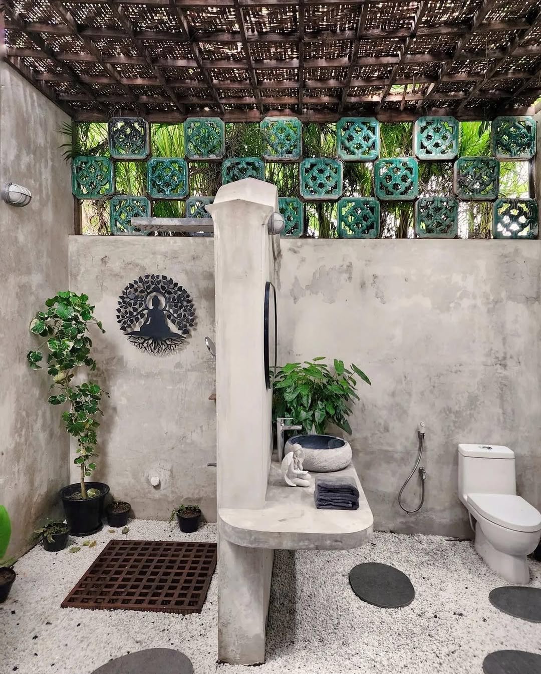 This space leans fully into that raw, grounded aesthetic. Concrete textures, white gravel flooring, and those green tile accents up top—it’s layered without feeling cluttered.