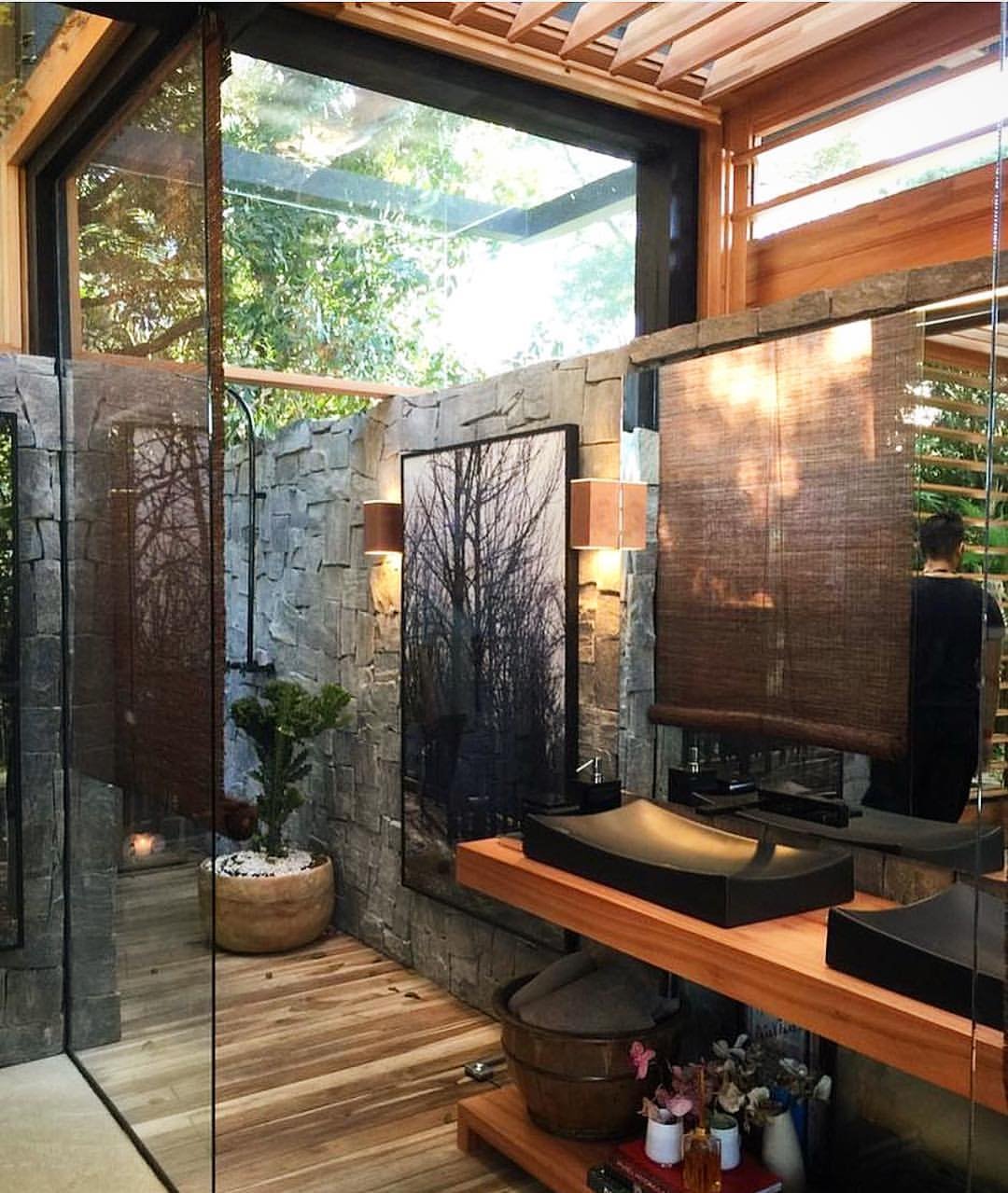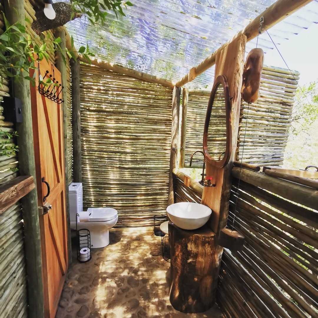 And this one? Pure nature immersion. Wood textures everywhere, dappled sunlight coming through, and that handcrafted sink setup—it feels raw, warm, and deeply connected to the outdoors.