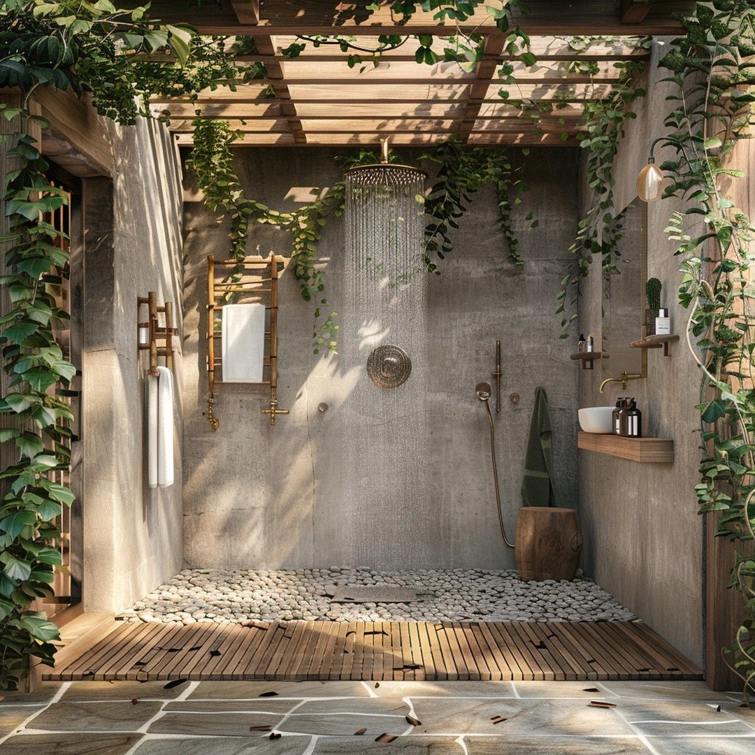 This is outdoor bathing turned into an experience. The mix of concrete, wood decking, and trailing greenery creates a space that feels equal parts spa and secret garden. And that rainfall shower under the pergola? Instant mood.
