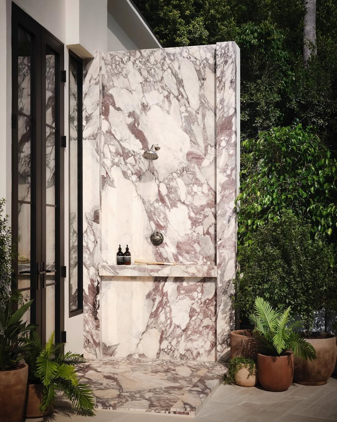 Now this is how you make an outdoor shower feel high-end. That dramatic marble with bold veining instantly steals the show, turning a simple setup into something sculptural. It’s clean, architectural, and unapologetically luxe.
