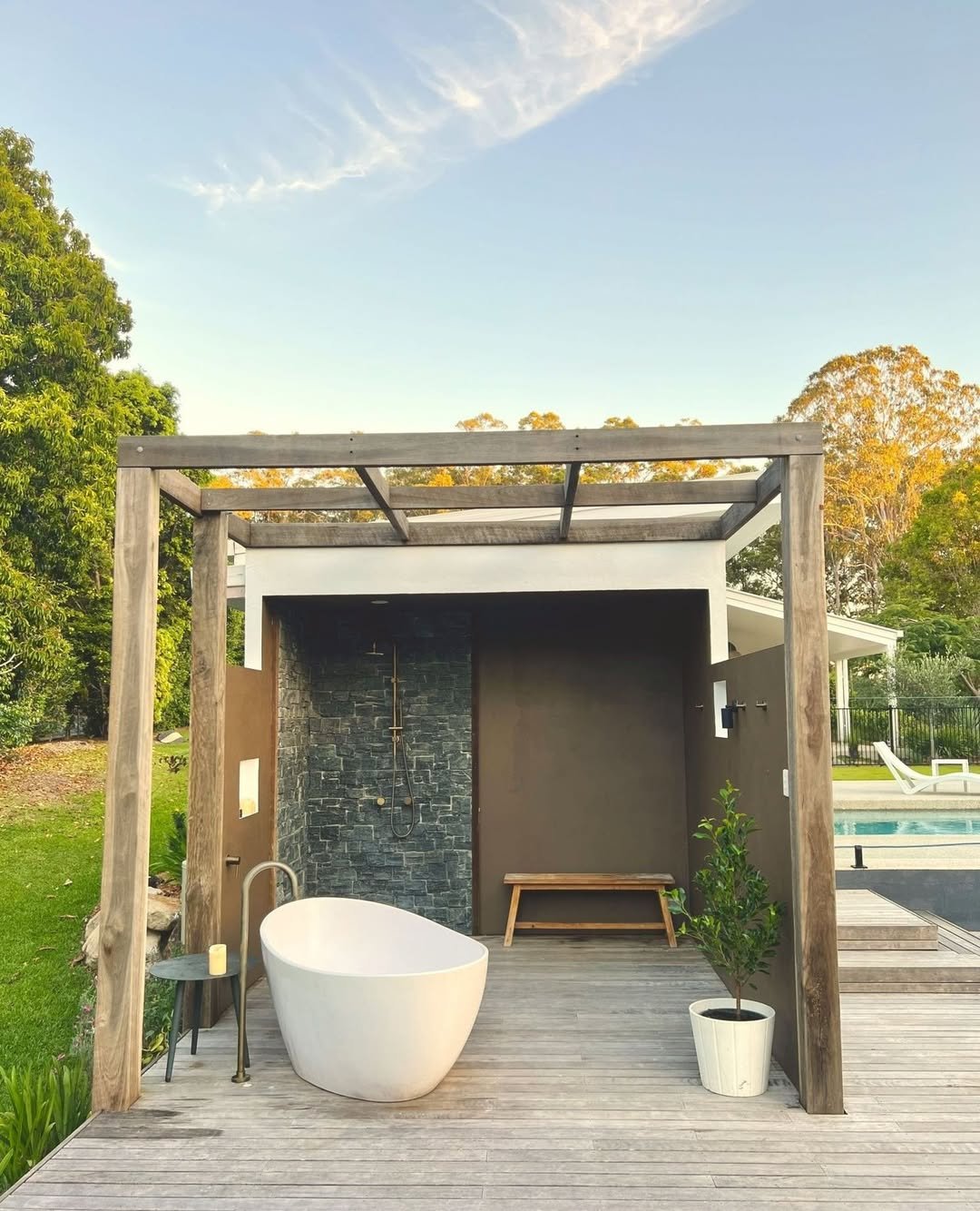 This setup feels like the perfect backyard upgrade. A freestanding tub under a timber pergola, clean lines, and just enough greenery to soften everything—it’s simple, but elevated.