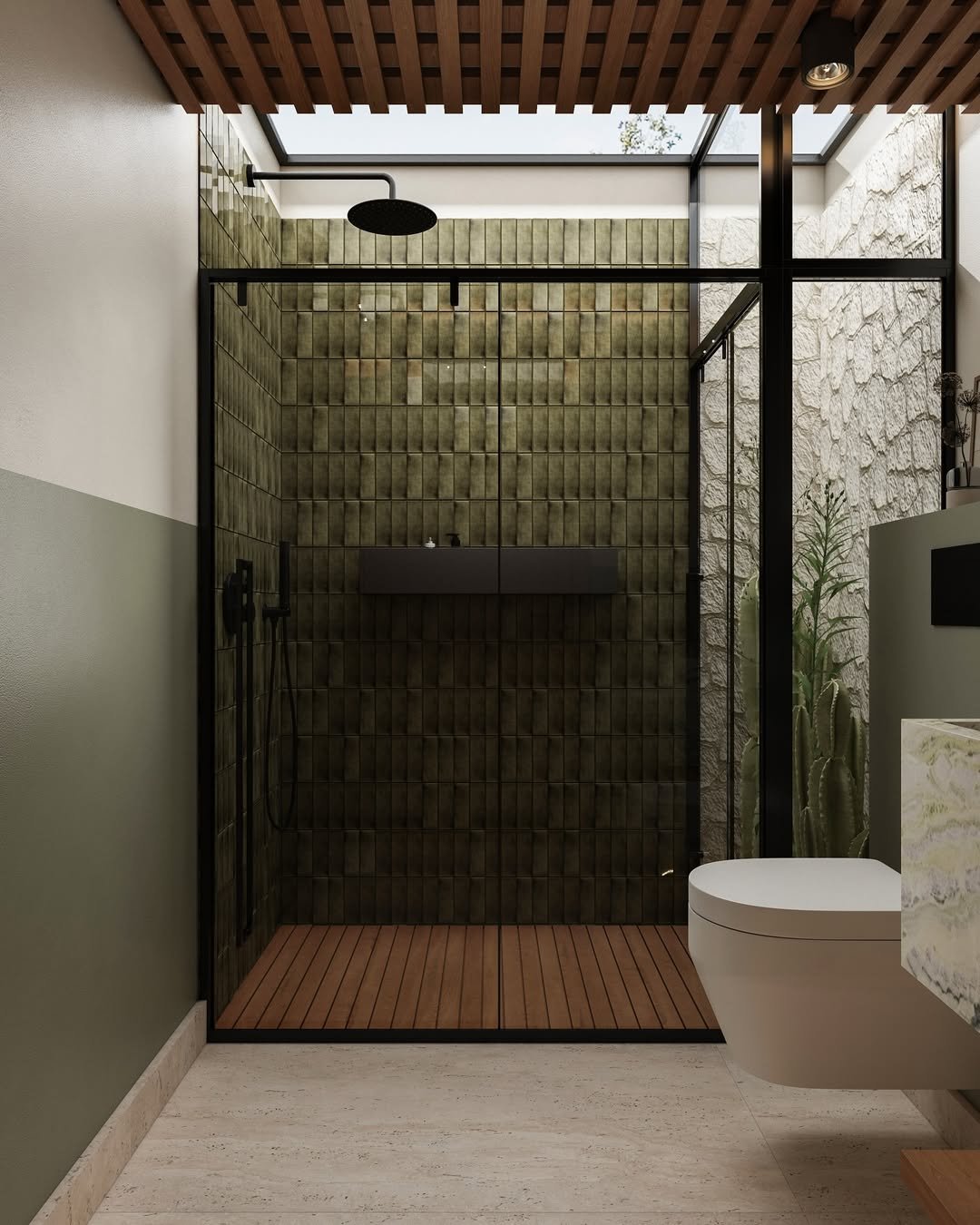 Clean, structured, and just a little dramatic. The dark tiles, glass enclosure, and overhead skylight create this sleek, spa-like vibe that feels both modern and calming.