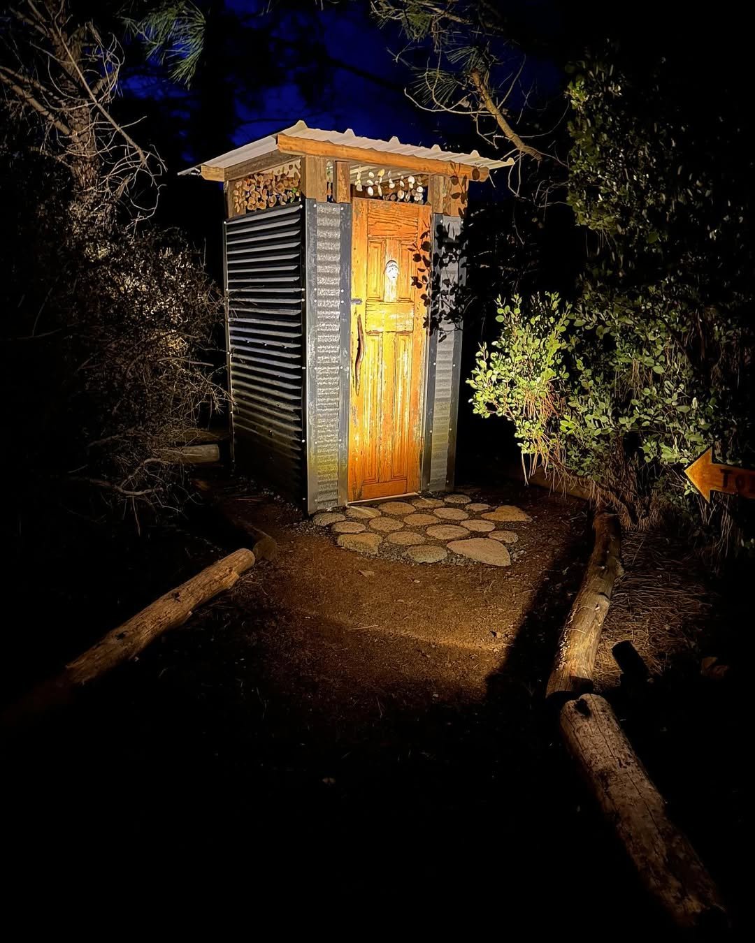 This one feels like a hidden storybook moment. A tiny outdoor bathroom tucked into nature, softly lit at night with that warm glow spilling out—it’s cozy in the most unexpected way.