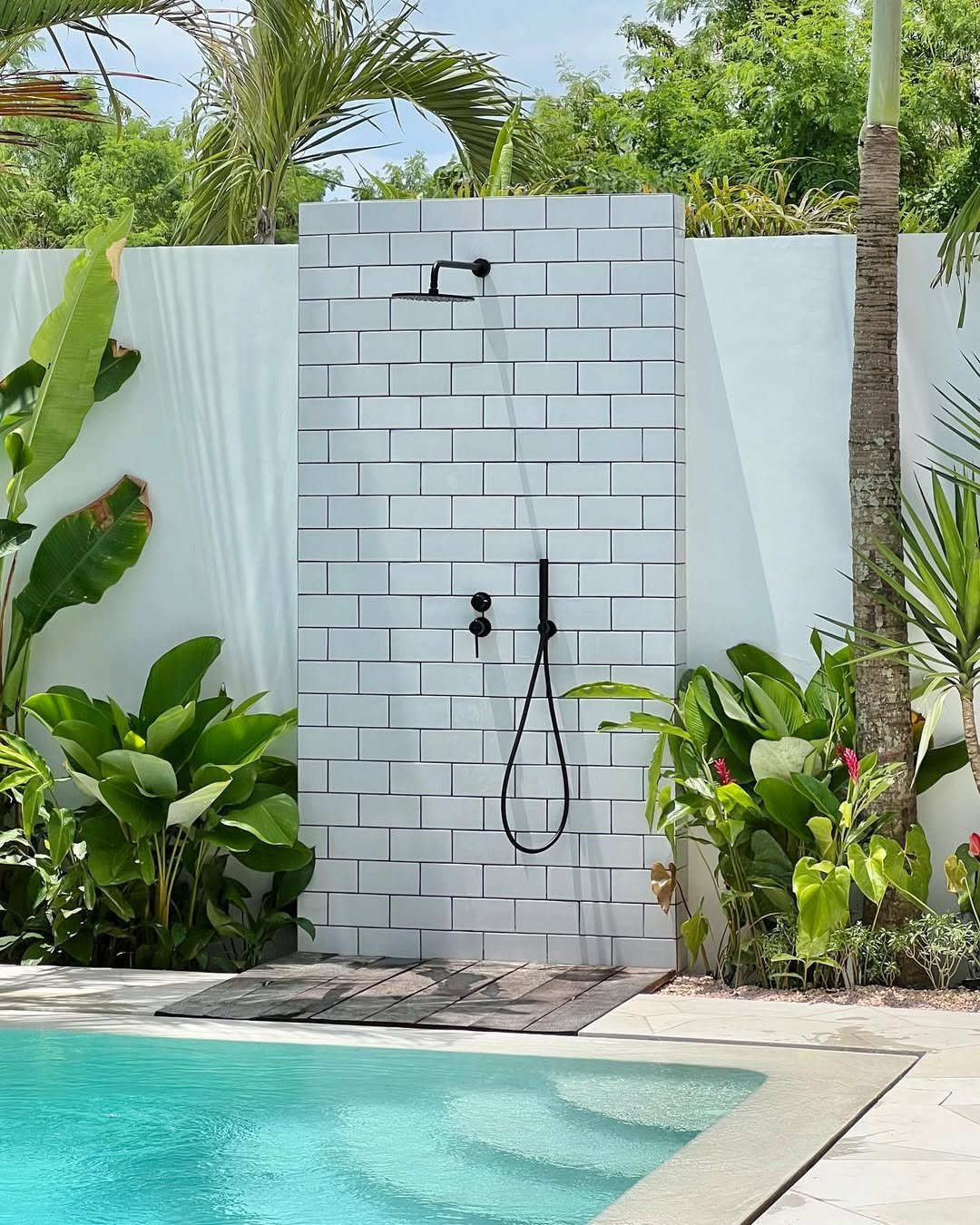 This one is all about crisp simplicity. White tiles, sharp edges, and that contrast of black fixtures—it’s clean, fresh, and made for sunny days by the pool.