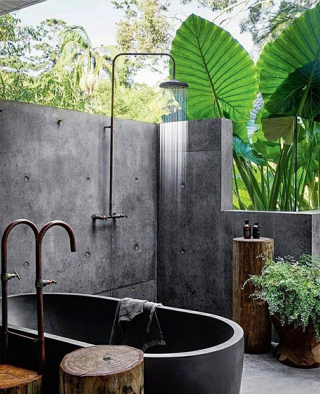 This is where things get a little moodier—in the best way. Concrete walls, bold greenery, and that deep black tub create a space that feels grounded and almost primal. Like nature and design are meeting halfway.