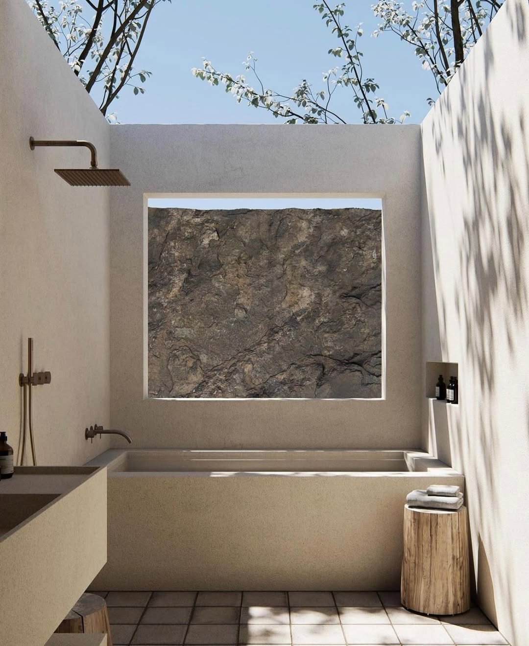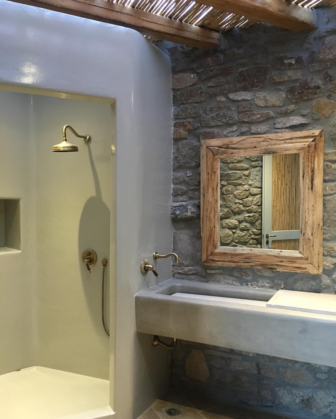 This one feels like it was carved straight out of a hillside. The raw stone walls, curved plaster shower, and chunky concrete sink give it that old-world charm that you just can’t fake. And that wooden pergola above? It filters the light in the dreamiest way—soft, dappled, almost cinematic.