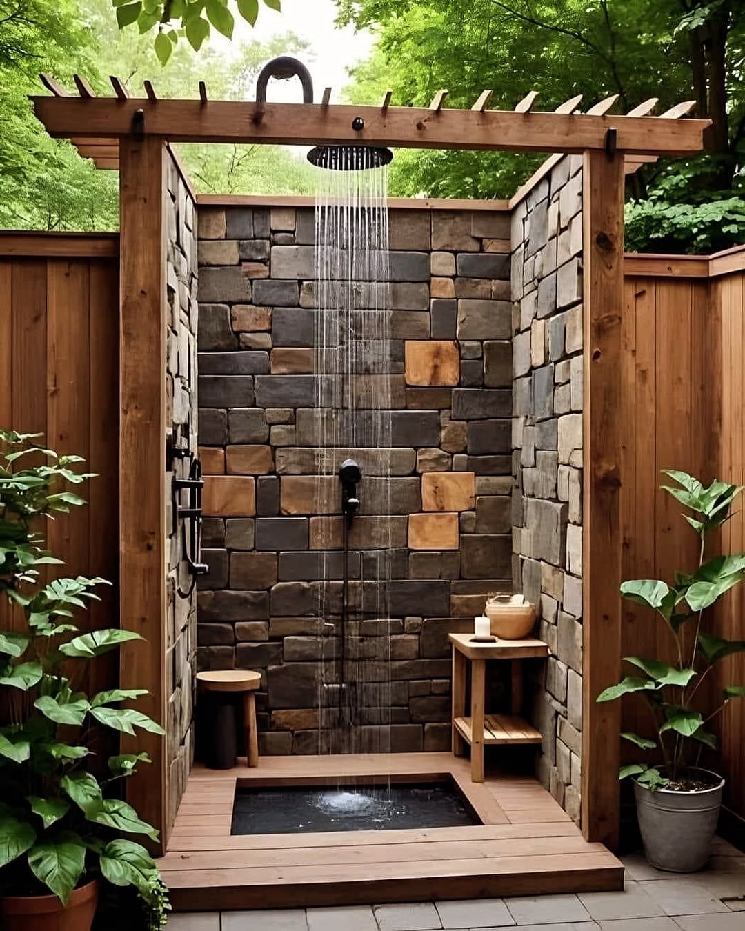 Now this is the kind of outdoor shower that makes you want to stay a little longer. The chunky stone wall, warm wood framing, and that perfectly centered rainfall head—it’s rustic, but in a polished way.