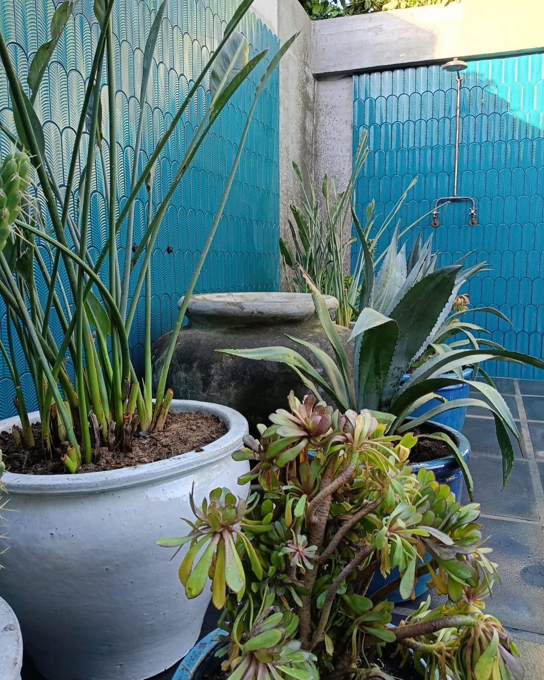 That tile color alone deserves a moment. The rich blue, paired with organic shapes and lush greenery, turns this into something that feels almost artistic.