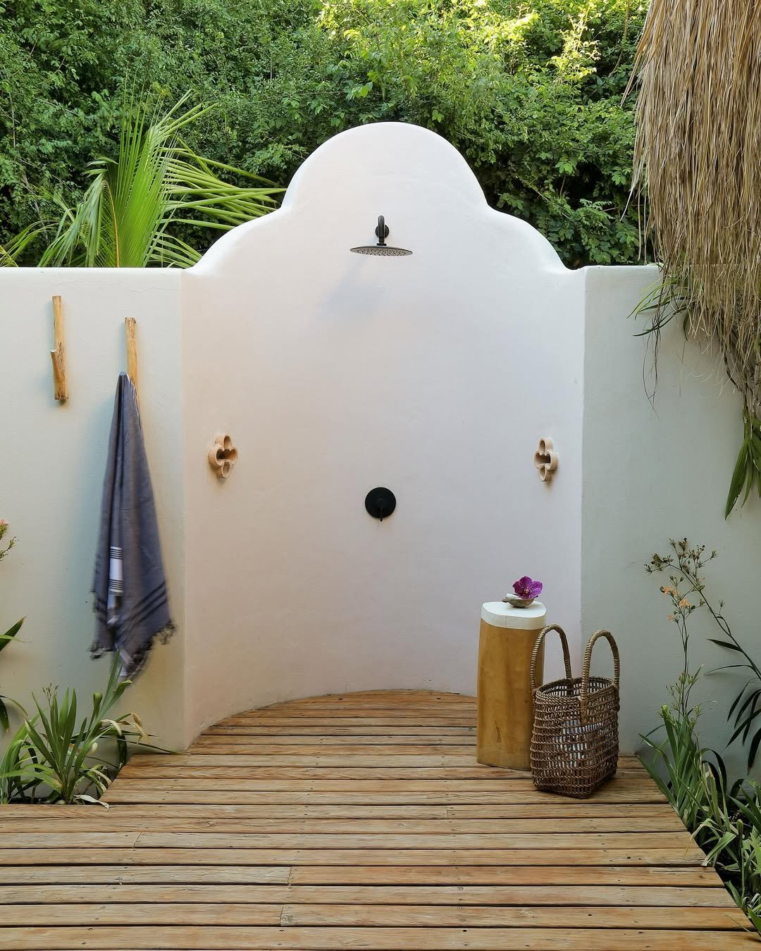 That curved wall instantly sets the tone—soft, sculptural, and just a little bit romantic. Paired with the wooden deck and surrounding greenery, it feels like a hidden coastal shower you’d stumble on barefoot after a swim.