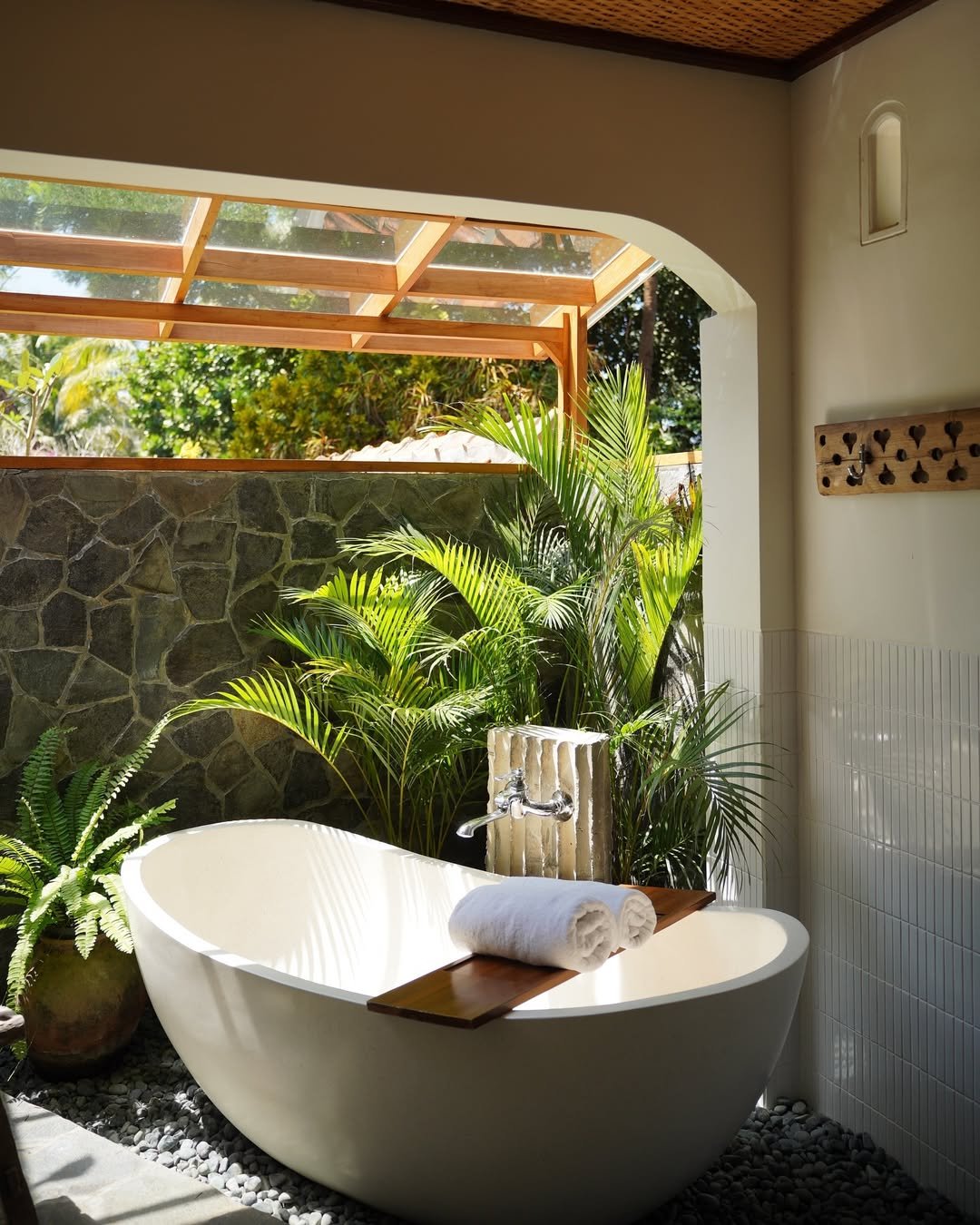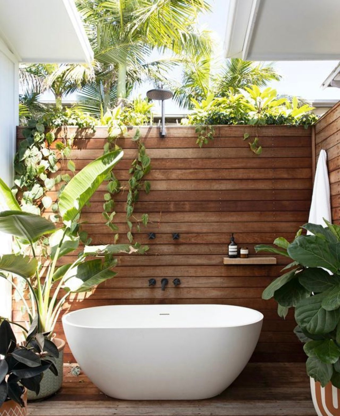 This is the definition of a slow-living moment. A freestanding tub tucked against warm wood slats, surrounded by lush plants—it’s giving private jungle retreat in the best way. The greenery wraps around you without feeling overwhelming.