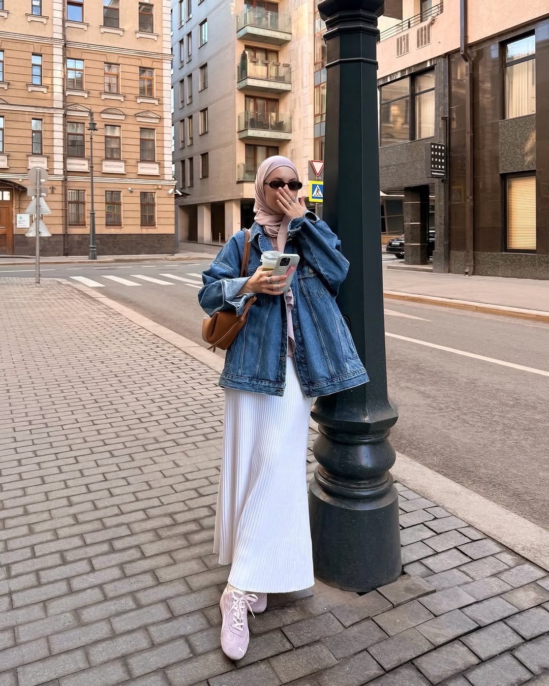 There’s something instantly calming about this look. A light denim jacket over a crisp white dress feels fresh, grounded, and quietly confident. The silhouette moves beautifully, soft but never shapeless.