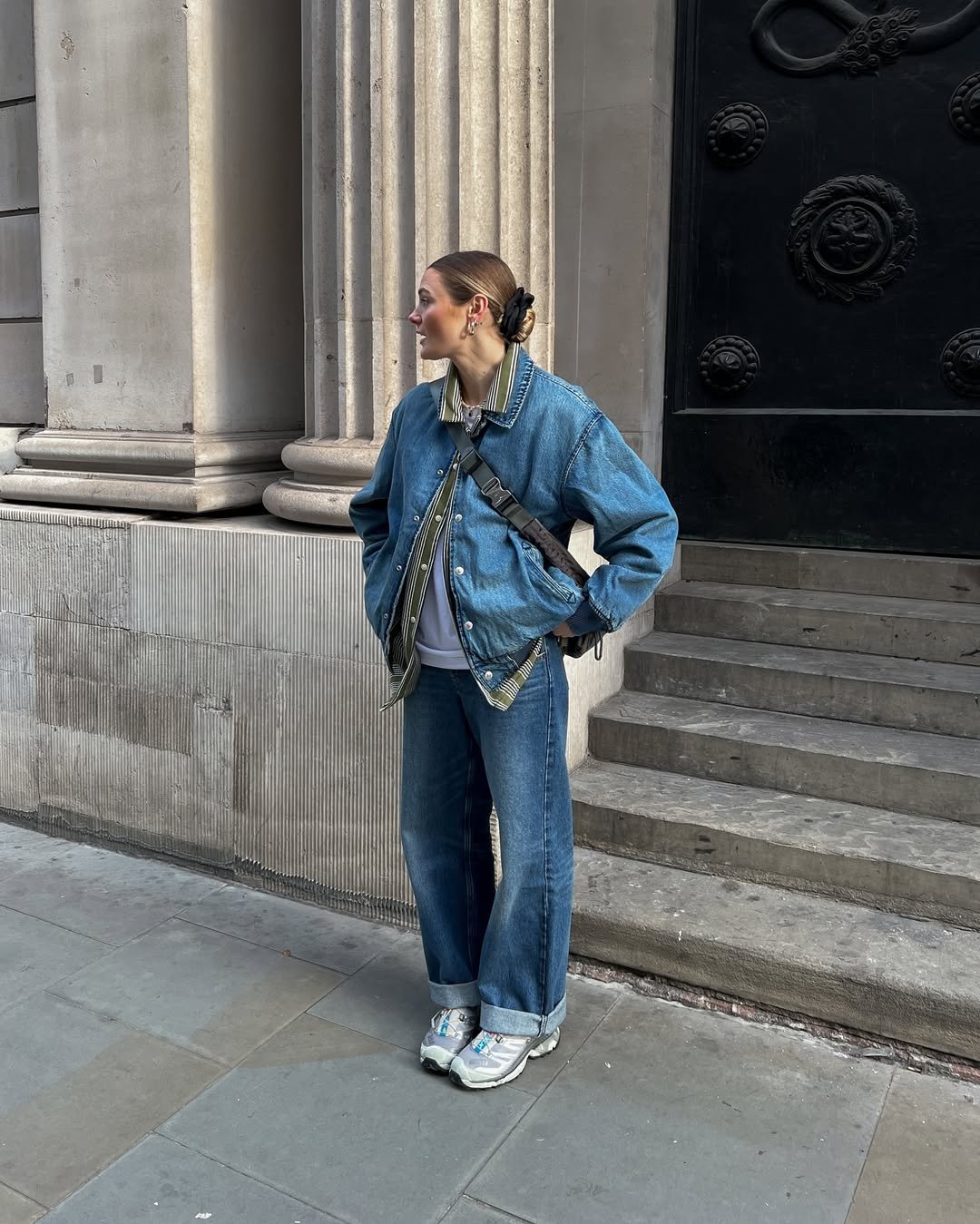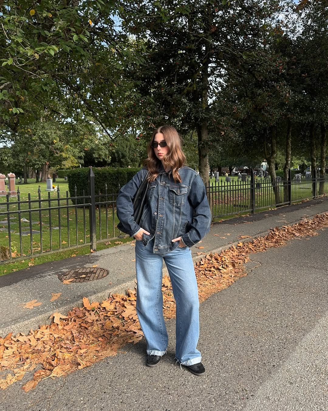 This look leans into comfort with confidence. The relaxed jean jacket paired with denim feels strong and intentional, like it belongs on city streets.