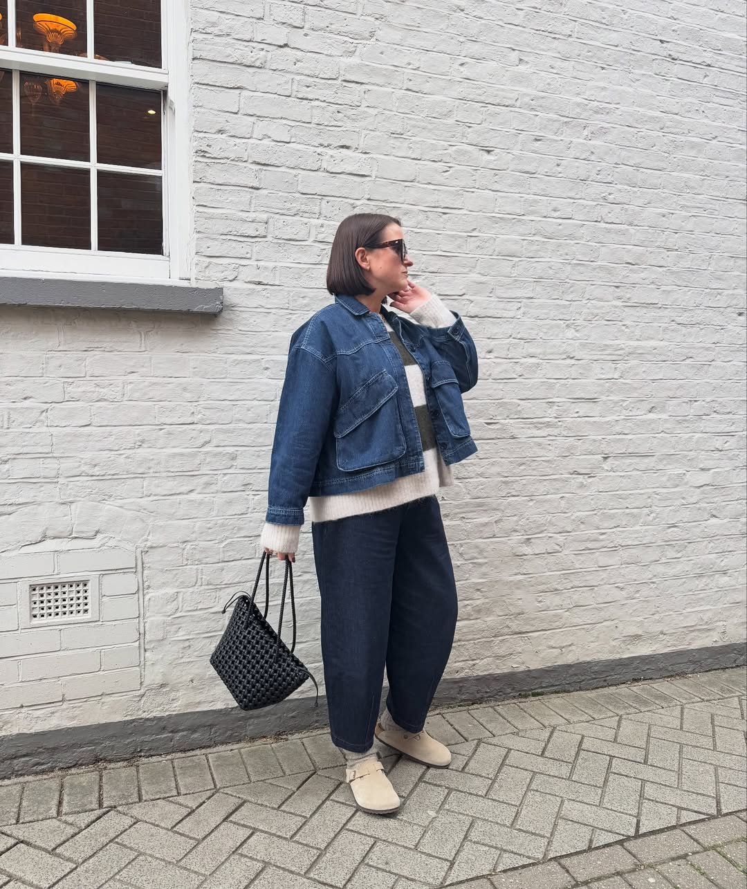 There’s a softness to this styling that feels very wearable. The jean jacket brings structure, but the overall look stays relaxed and unfussy.