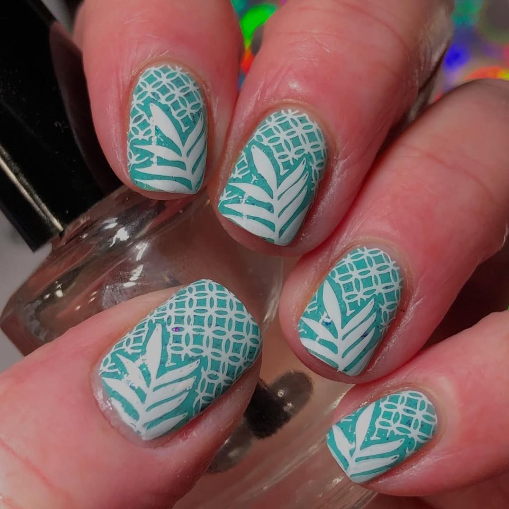 This manicure feels like a breezy cabana moment—cool, crisp, and totally graphic. The seafoam teal backdrop gives off serious retro resort energy, like the tiles you’d find lining a mid-century Palm Springs pool. Layered overtop, the stark white palm fronds add a bold botanical twist, clean and confident.