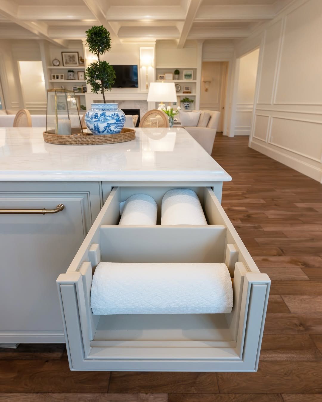 This is peak hidden functionality. A dedicated drawer section just for paper towels keeps everything out of sight but perfectly organized.