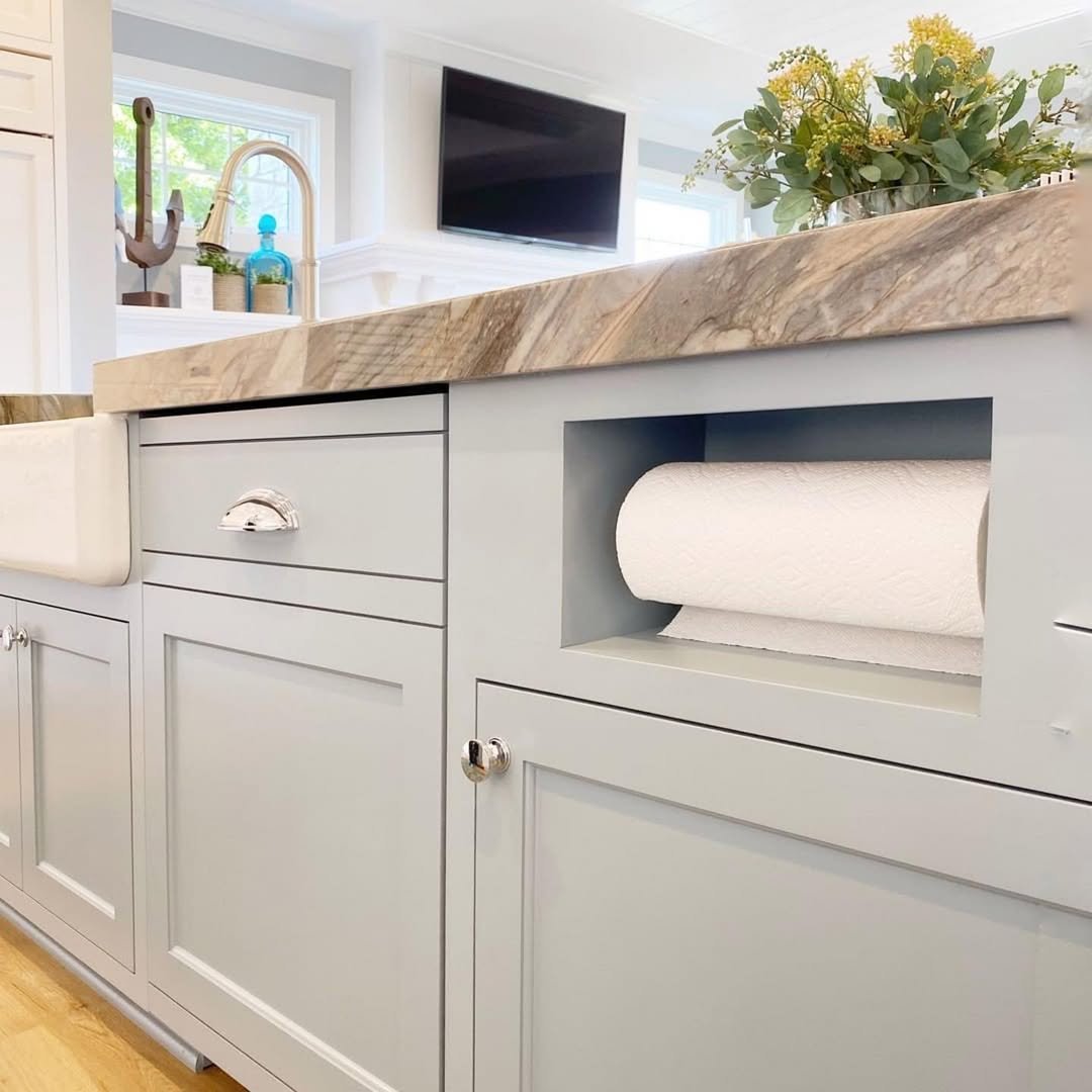 This is one of those ideas that makes you wonder why it’s not everywhere. Built right into the cabinetry, the paper towel holder disappears into the design while still being super easy to grab.