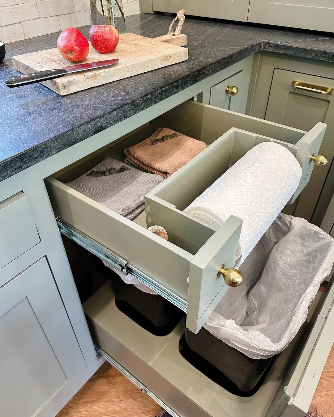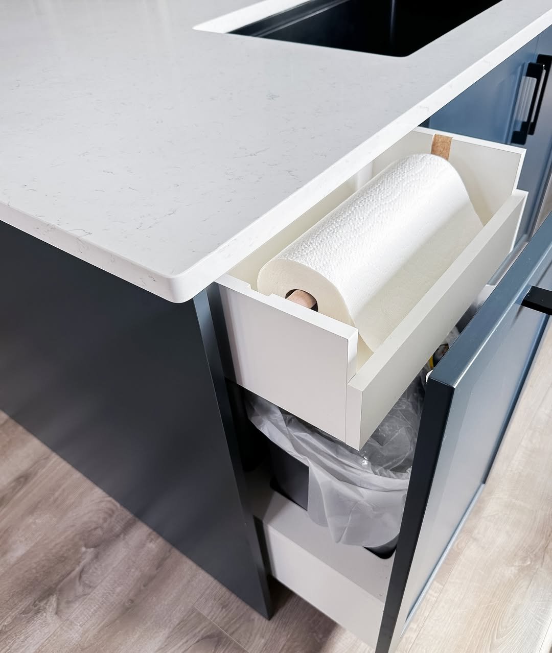 Now this is next-level practical. A pull-out drawer that hides the paper towel roll keeps everything tucked away but still fully accessible when you need it.