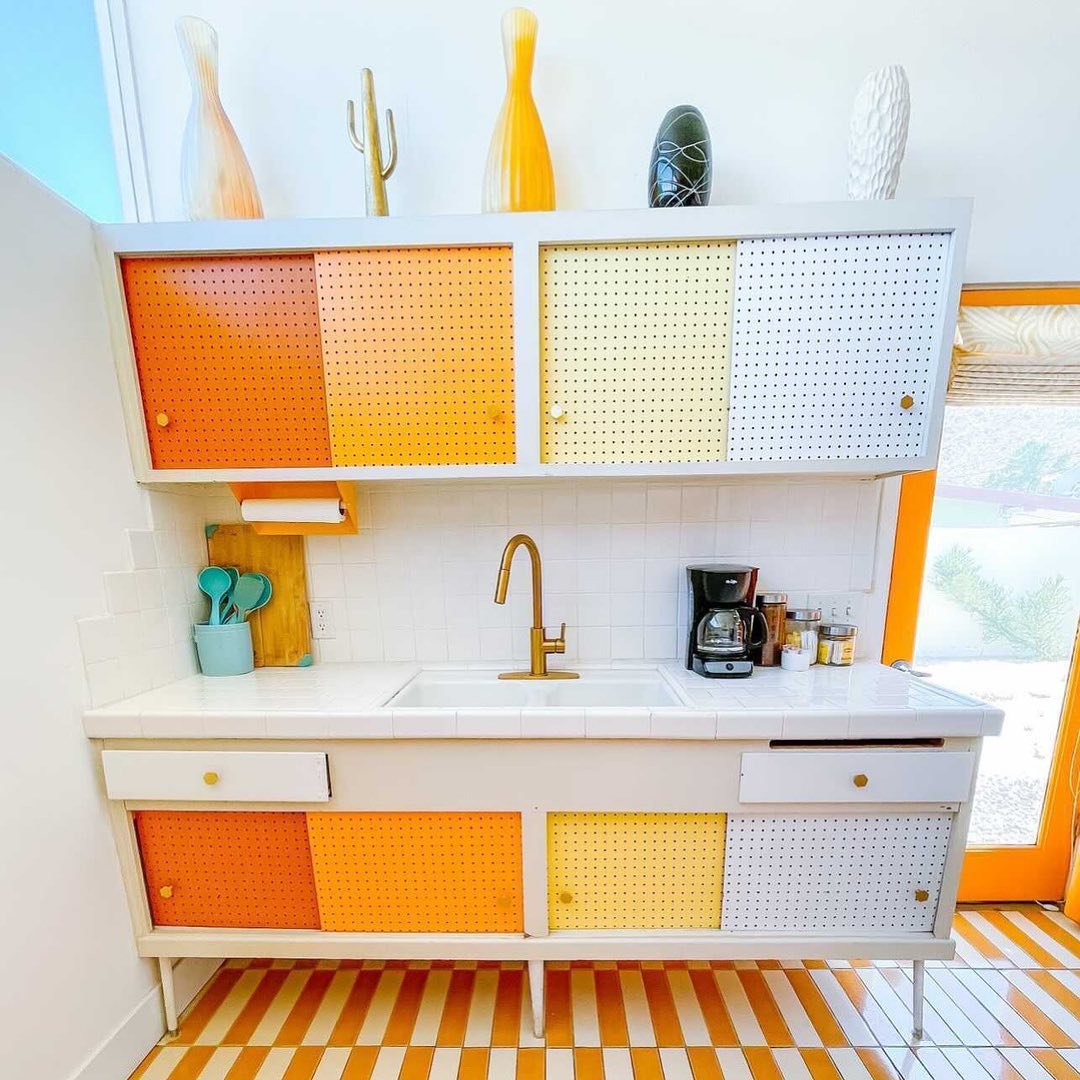 This one is pure personality. The bold color-block cabinets already steal the show, but that tucked-under paper towel holder just blends right into the vibe like it was always meant to be there.