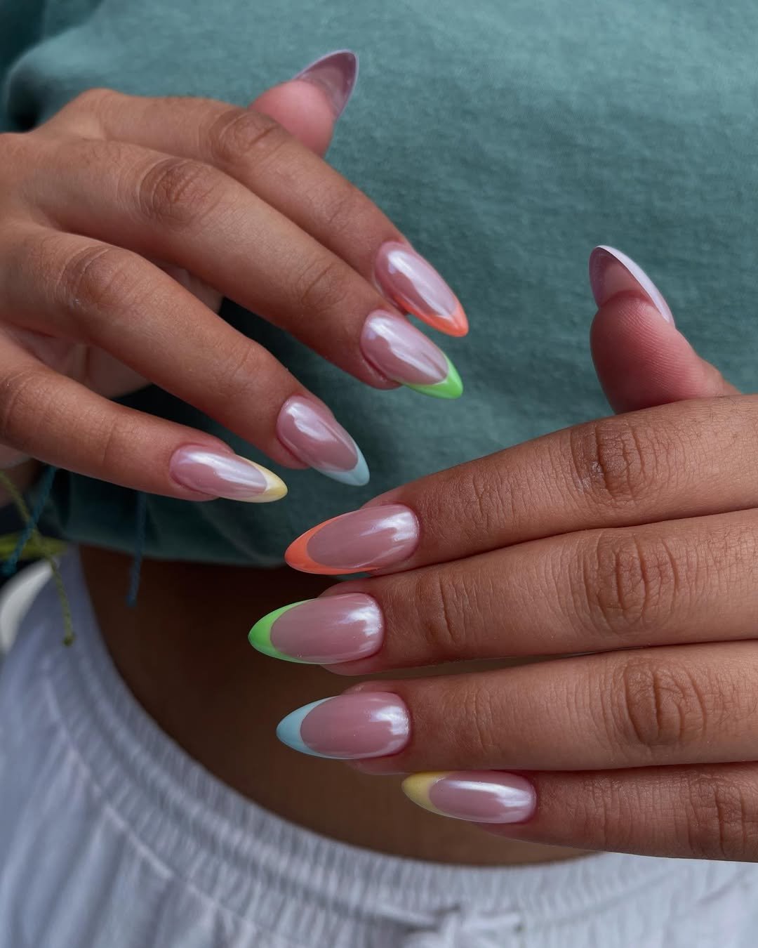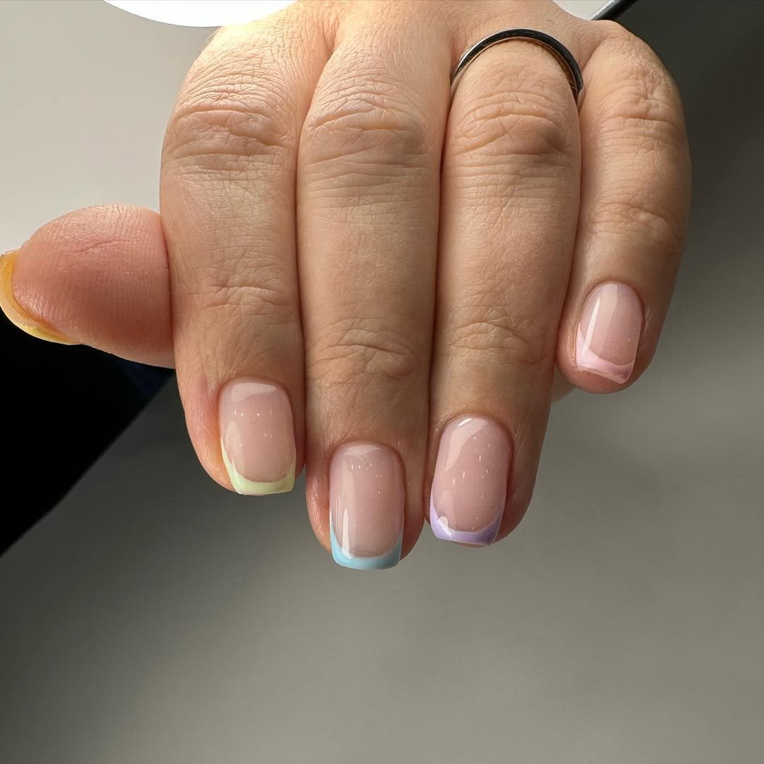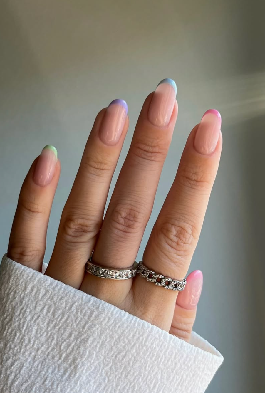 A softer take on the pastel French, these barely-there rainbow tips are giving clean-girl energy with a twist. Each color is so gently blended that you almost have to double-take — which honestly is part of the charm.