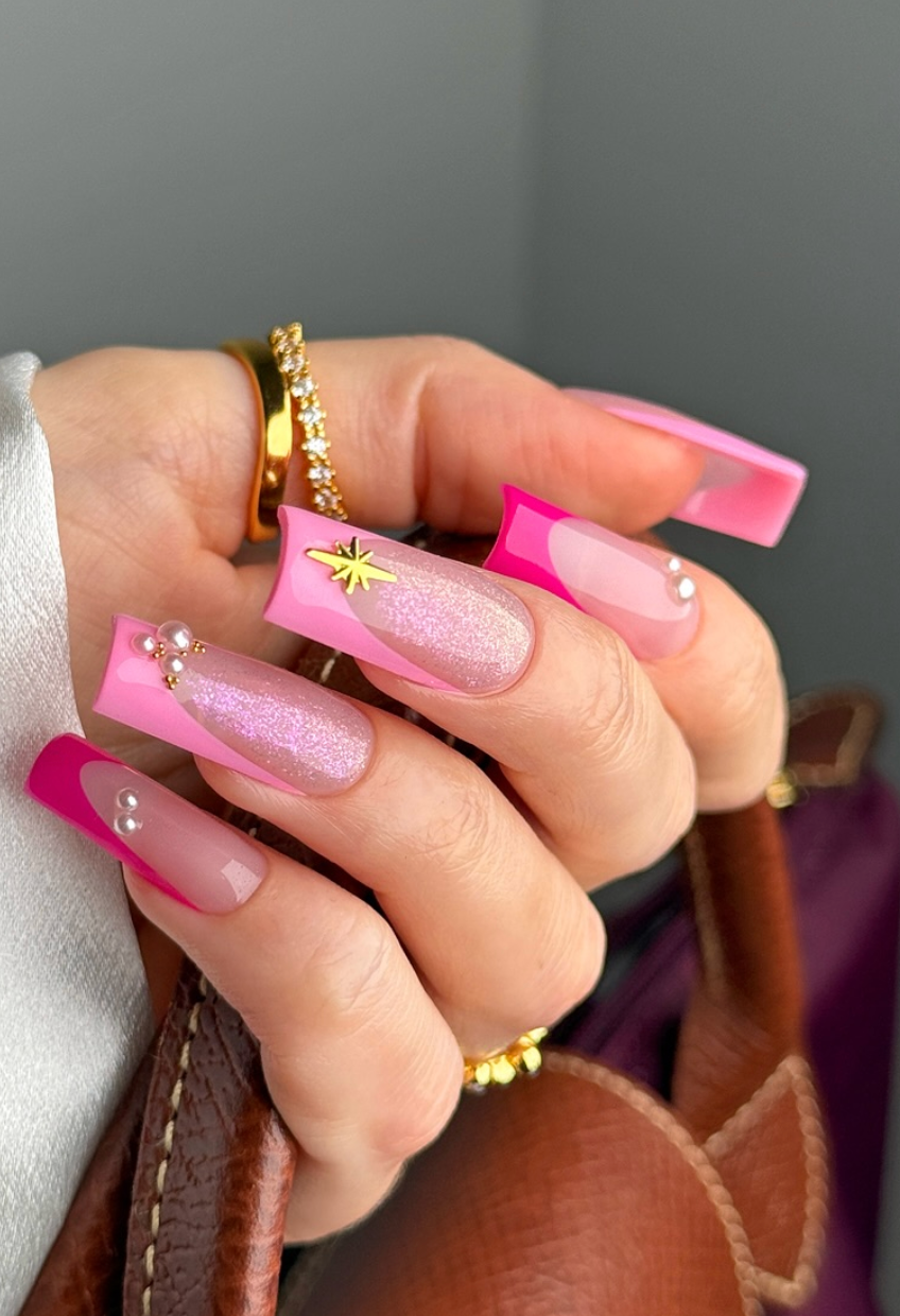 Pink French tips with sculpted edges, pearly accents, and a starburst charm — this is pastel French for the girl who wants a little drama. The mix of shimmer, gloss, and hot-pink framing creates a manicure that looks high-fashion but still sweet.