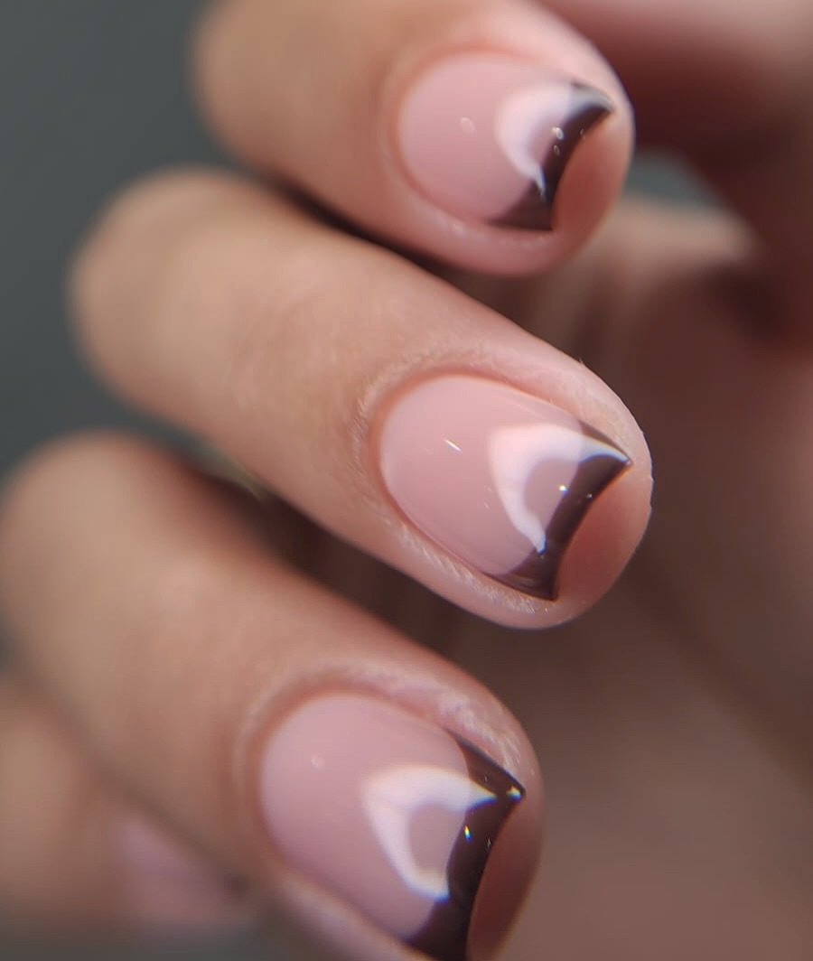 A chic twist on pastel French: soft nude bases paired with velvety chocolate-brown tips. The contrast is striking but still incredibly soft thanks to the translucent blush base.