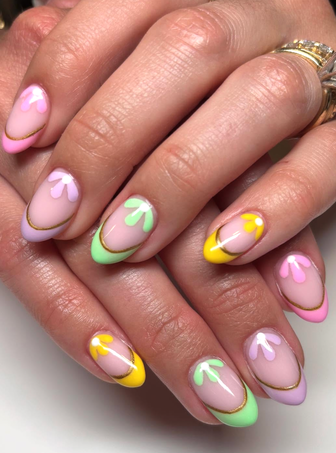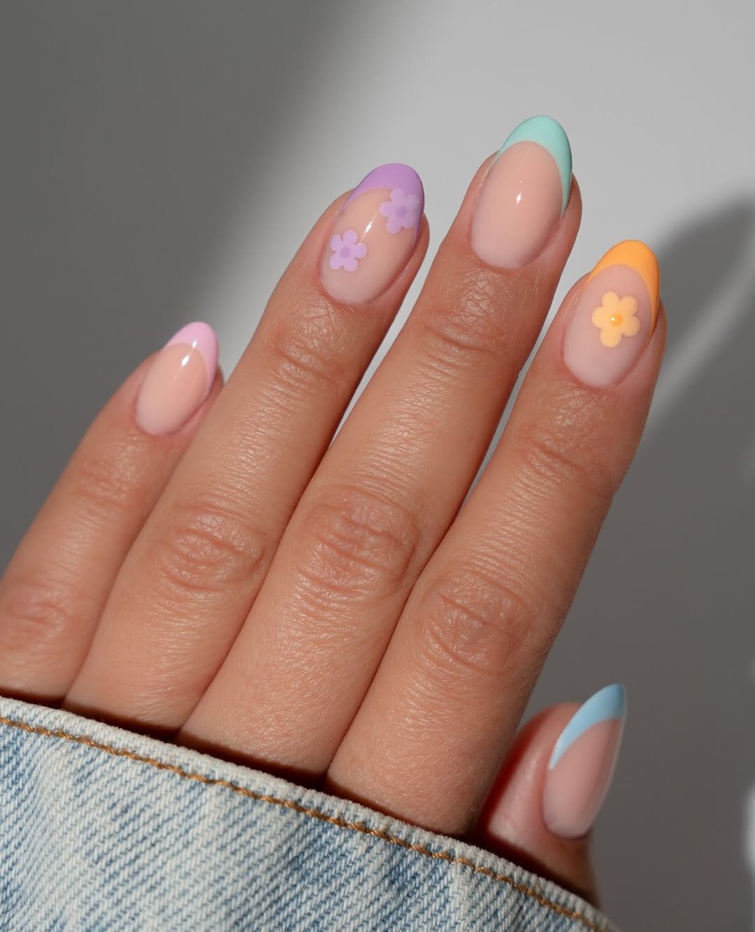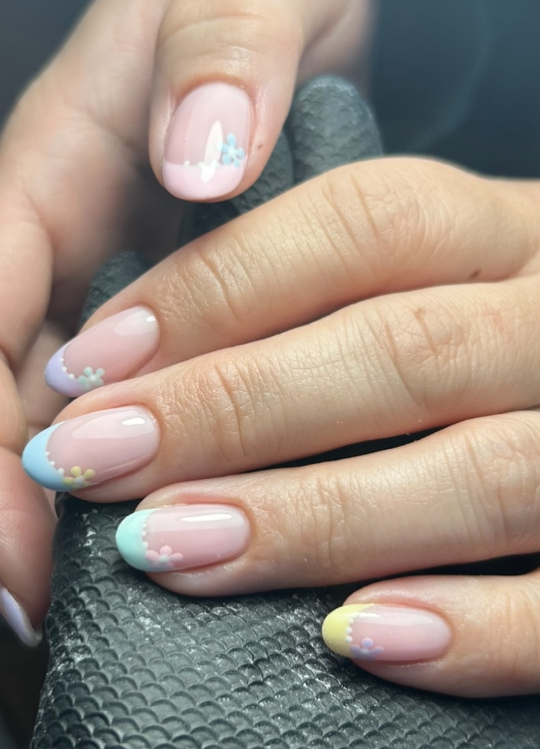 Each nail gets its own pastel French moment — baby yellow, mint, bubblegum pink, and powder blue — all finished with tiny daisy accents. It’s cheerful without being childish, thanks to the flawless almond silhouette and glossy base.