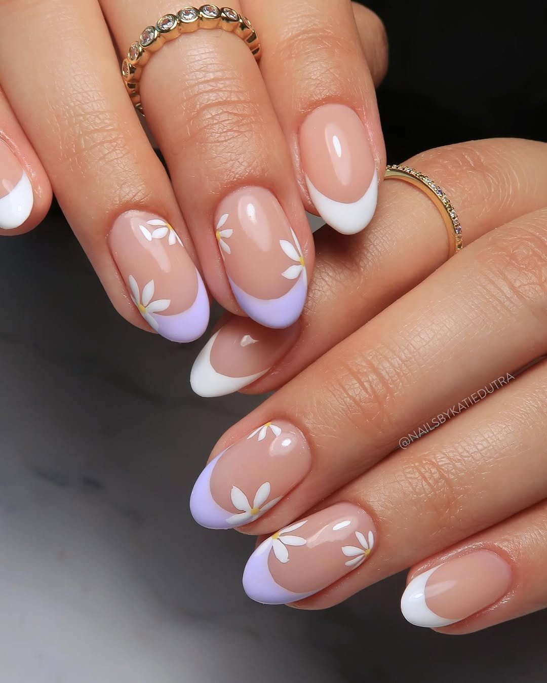 A daisy-kissed pastel French? Yes please. This set mixes crisp white, soft lavender, and tiny floral accents, creating a manicure that feels like a picnic in perfect lighting.