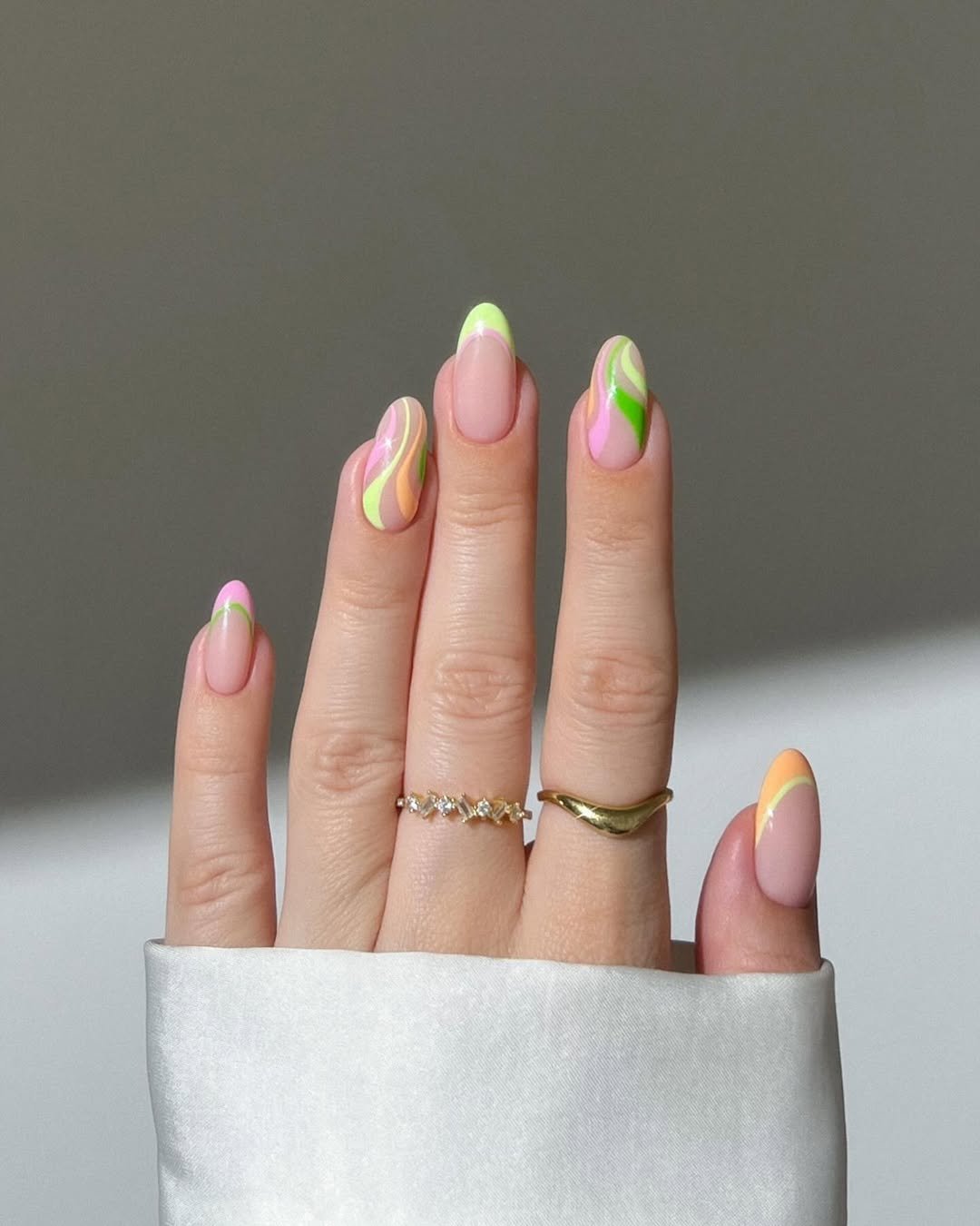This set is basically sunshine bottled into nail art. Those swirly pastel tips with pops of neon green and peach feel like a retro summer ad — but make it chic. It’s playful without going full chaotic, the kind of manicure that says “yes, I’m fun, but also yes, I read.”