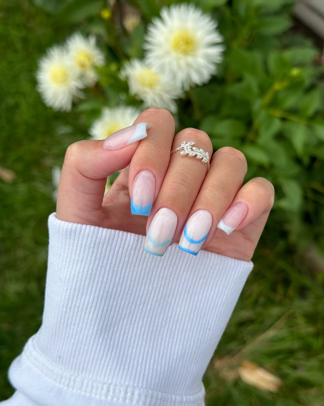 Those clean square tips get a refreshing upgrade with layered ocean blues — from crisp azure to airy sky. The contrast against the sheer white-wash base gives it that breezy, beach-day feeling.