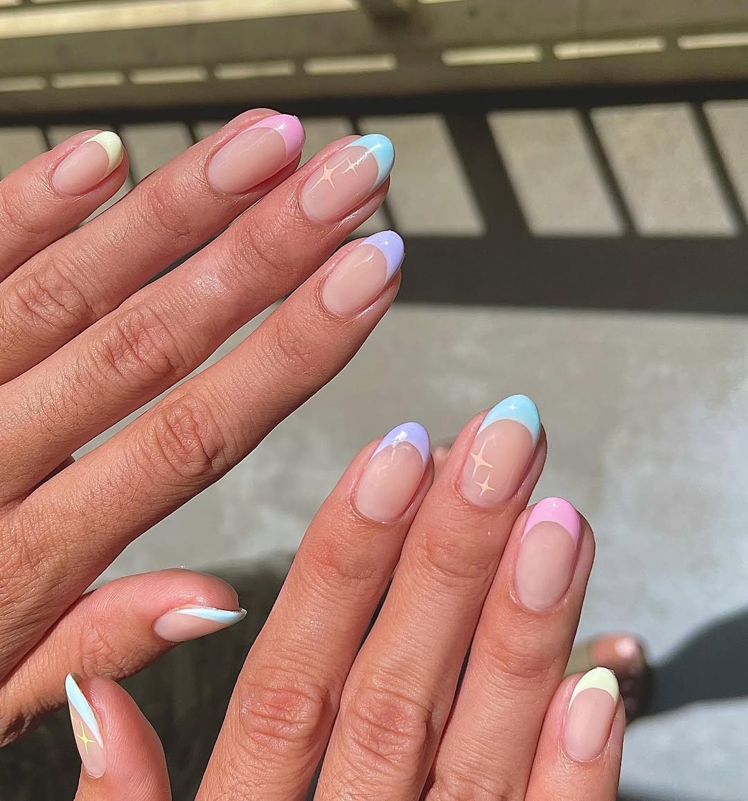 These airy pastel tips have a dreamy shimmer to them — not glittery, just softly glowing. The color placement is playful but balanced, and those tiny star accents? A subtle magical touch.