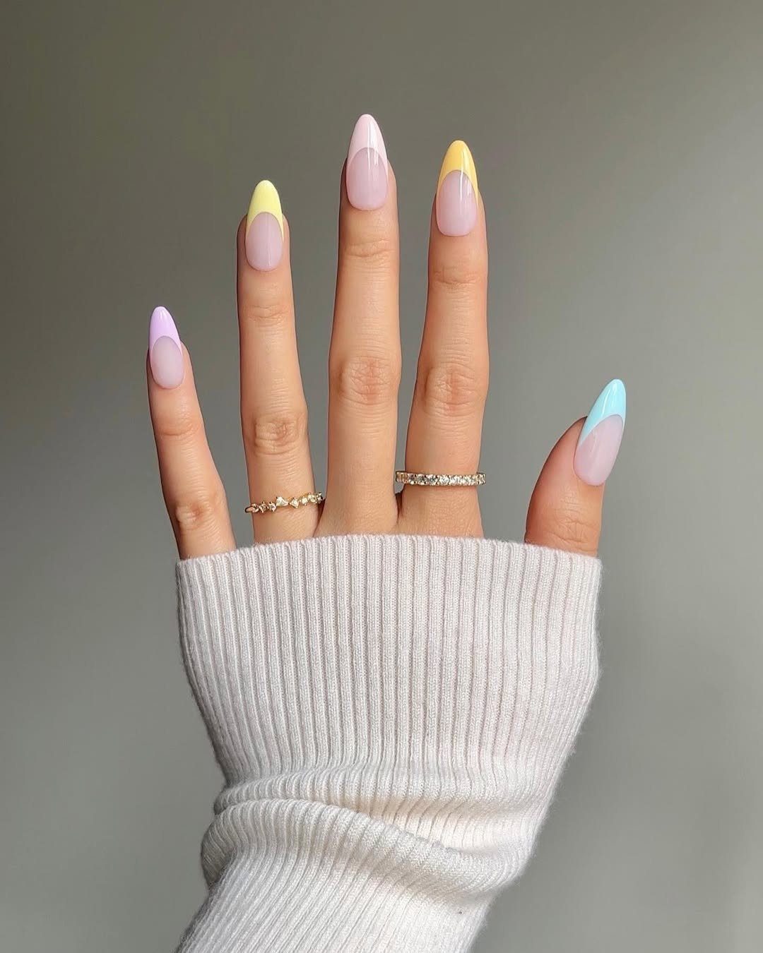 This almond set plays with color blocking in the dreamiest way: split diagonals in violet, periwinkle, sky blue, baby pink, and a whisper of olive. The base stays sheer and luminous, letting those bold pastel tips steal the spotlight without feeling heavy.