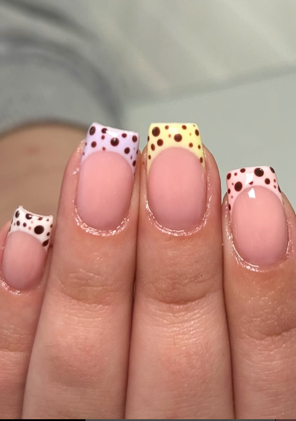 This playful pastel French brings out the sweetest mix of soft color and fun whimsy. Each tip gets its own personality — lilac, lemon, blush — all sprinkled with tiny chocolate-brown dots that feel almost retro, almost ice-cream-parlor chic.