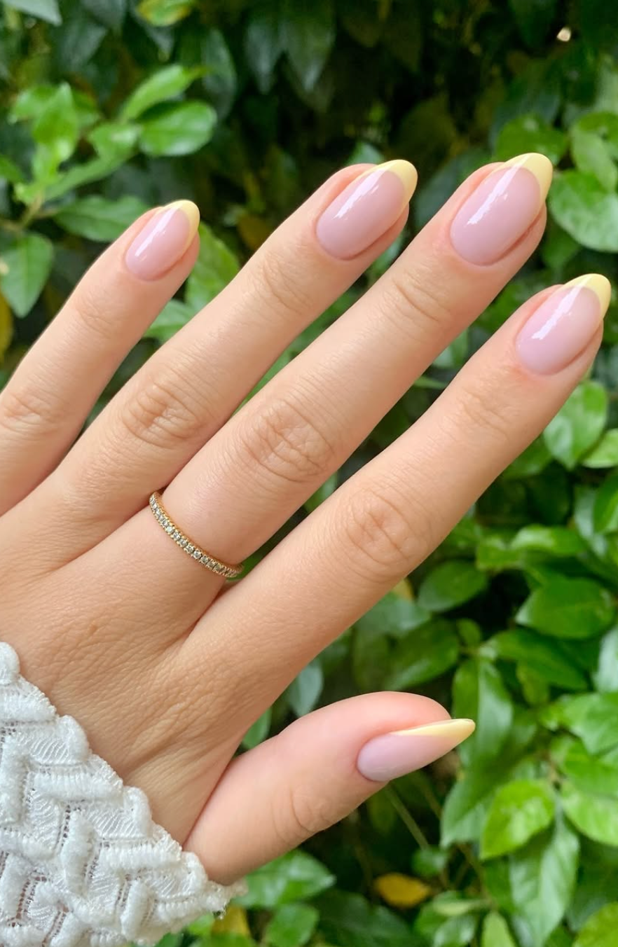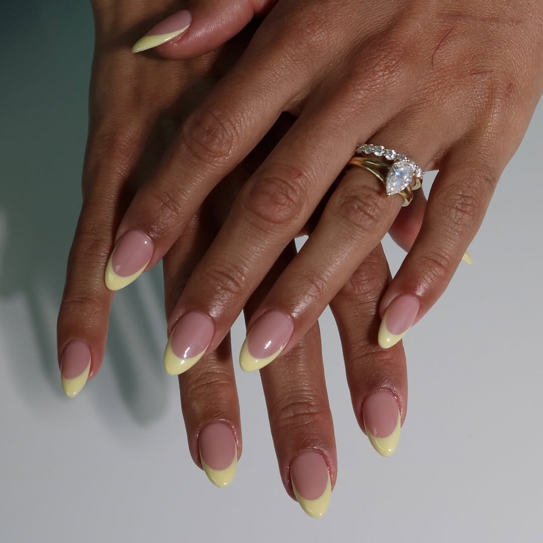 Soft lemon-yellow tips paired with a creamy nude base — simple, bright, and so effortlessly happy. The almond shape gives everything a soft curve, letting the color pop without overpowering the natural nail.