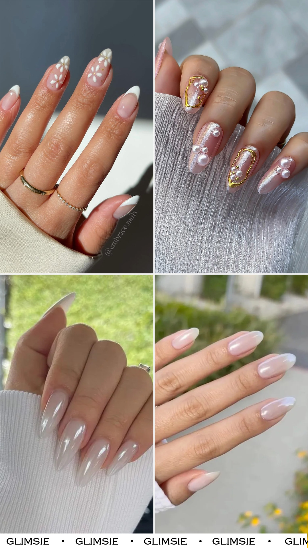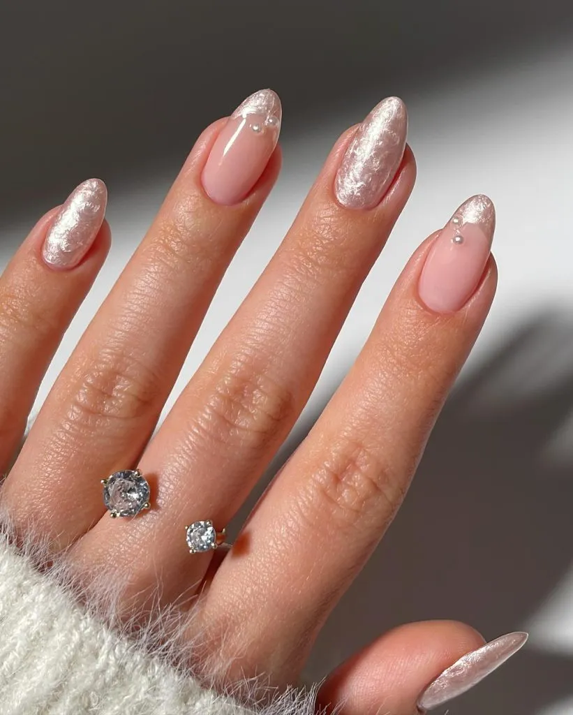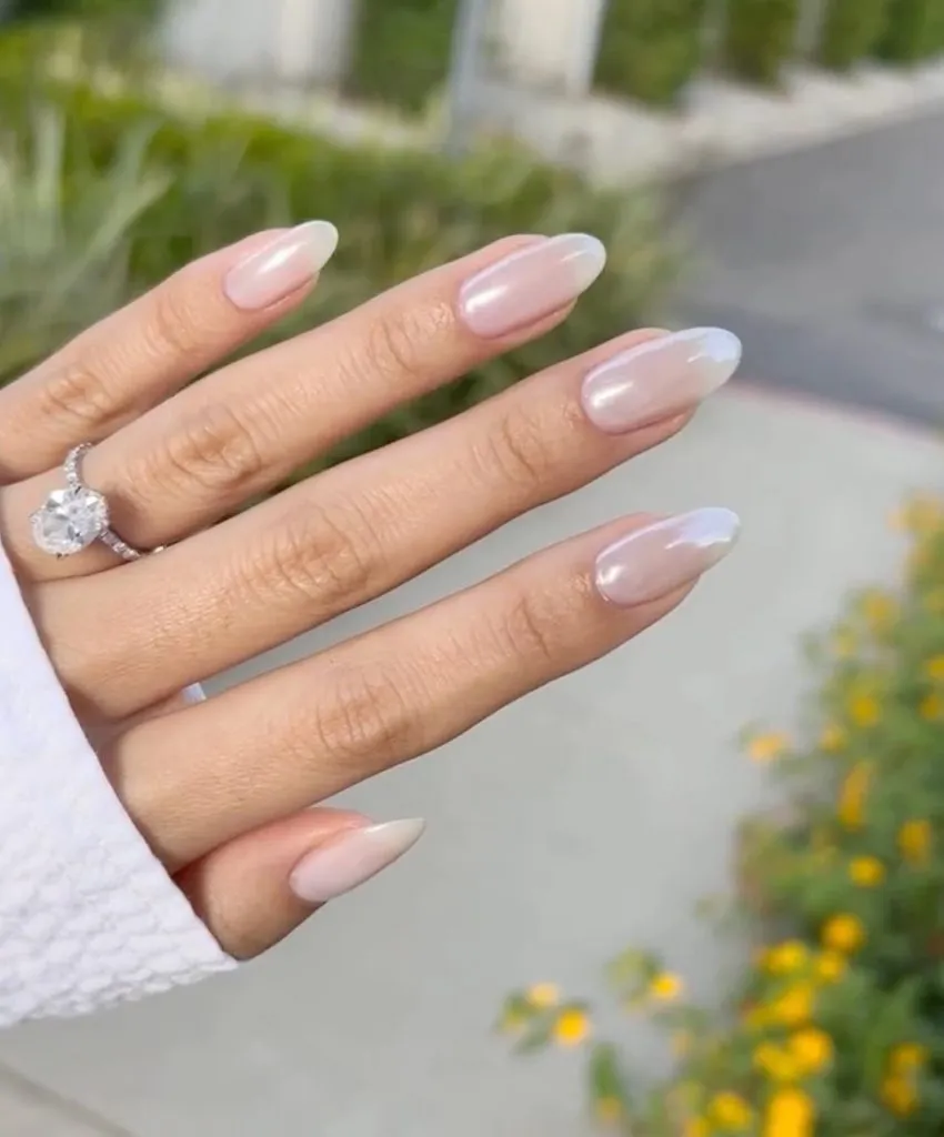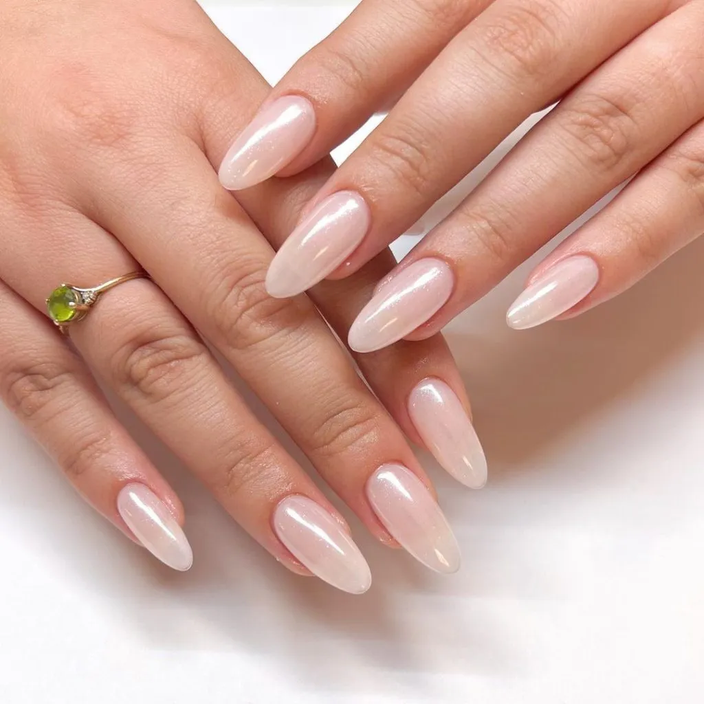A sheer pearl wash on almond nails that feels almost ethereal. The glow is soft, milky, and candlelit — basically the bridal version of the “your skin but better” makeup trend.