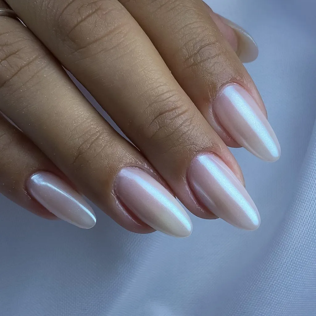 These almond nails glow with the softest, glowing pearl shift — almost like moonlight resting on a still lake. The elongated shape paired with the reflective sheen gives them this ethereal, almost celestial vibe.