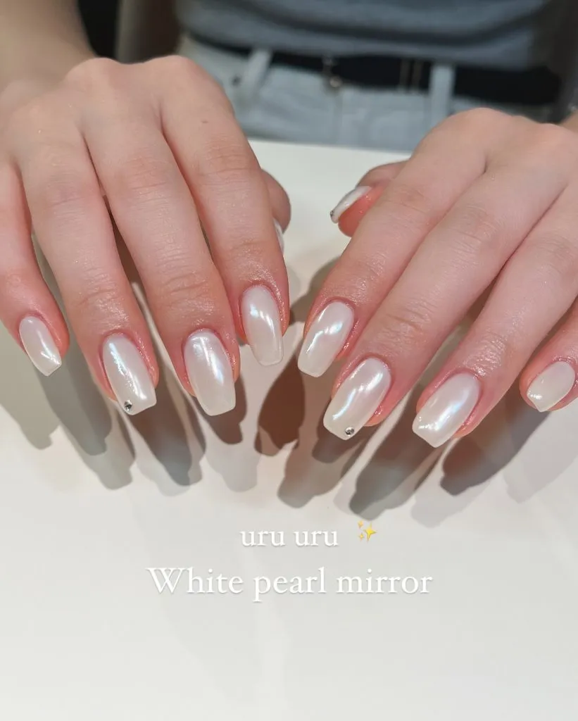 This “white pearl mirror” finish is pure magic — almost liquid in the way it reflects light. Each nail looks dipped in a soft, opalescent glaze that feels luxurious yet still beautifully clean.