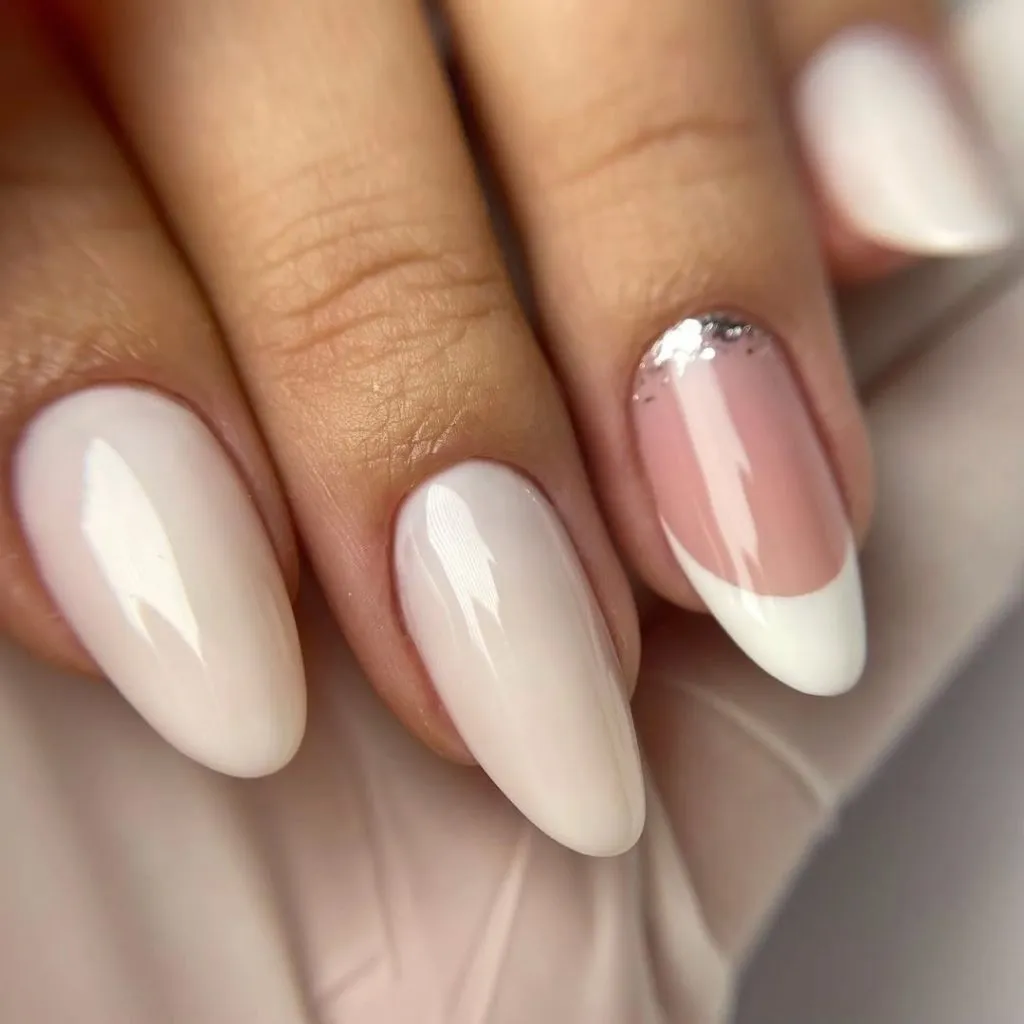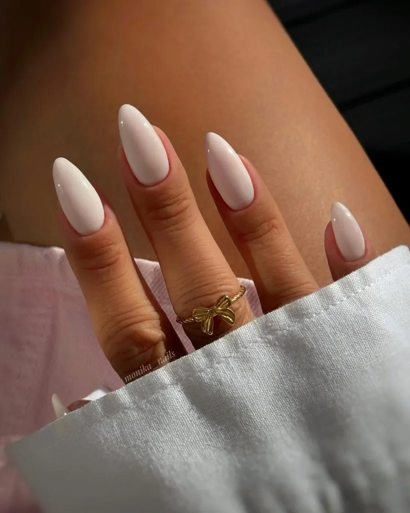 A pure white almond is always striking, but add a pearly sheen and suddenly it becomes bridal perfection. These nails are clean, sculpted, and luminous — like polished porcelain made wearable.