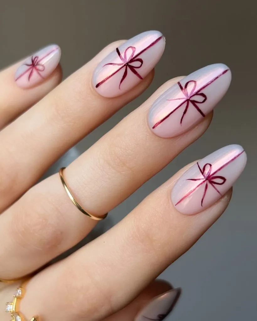How adorable are these tiny ribbon designs? Each nail feels like a little gift wrapped for the big day, with delicate burgundy lines adding just the right pop of contrast against the pearly base.