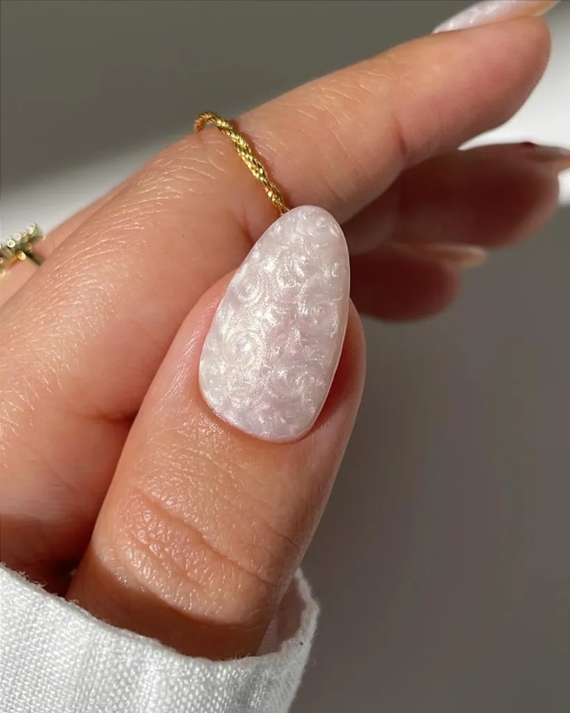 This seashell-textured pearl nail is pure artistry. The raised, swirled detailing catches light in such a mesmerizing way, almost like mother-of-pearl rippling underwater. It brings that handcrafted, couture energy to a single statement nail—perfect for brides who want something special without going full maximalist.