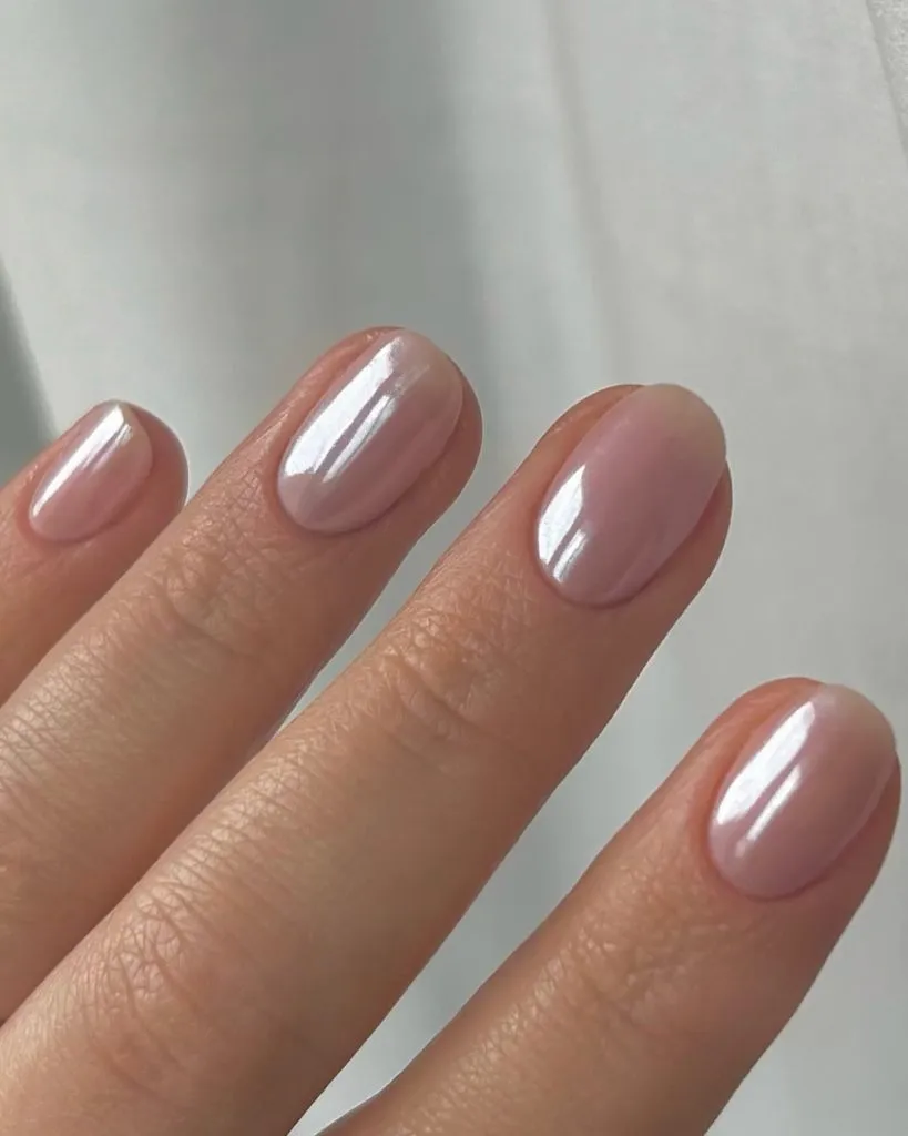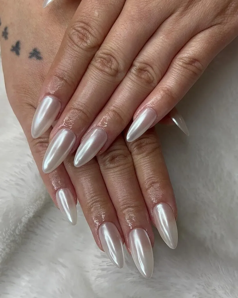 A glossy, clean pearl finish that looks like it came straight out of a bridal editorial. It’s minimal, timeless, and ridiculously flattering on every skin tone.