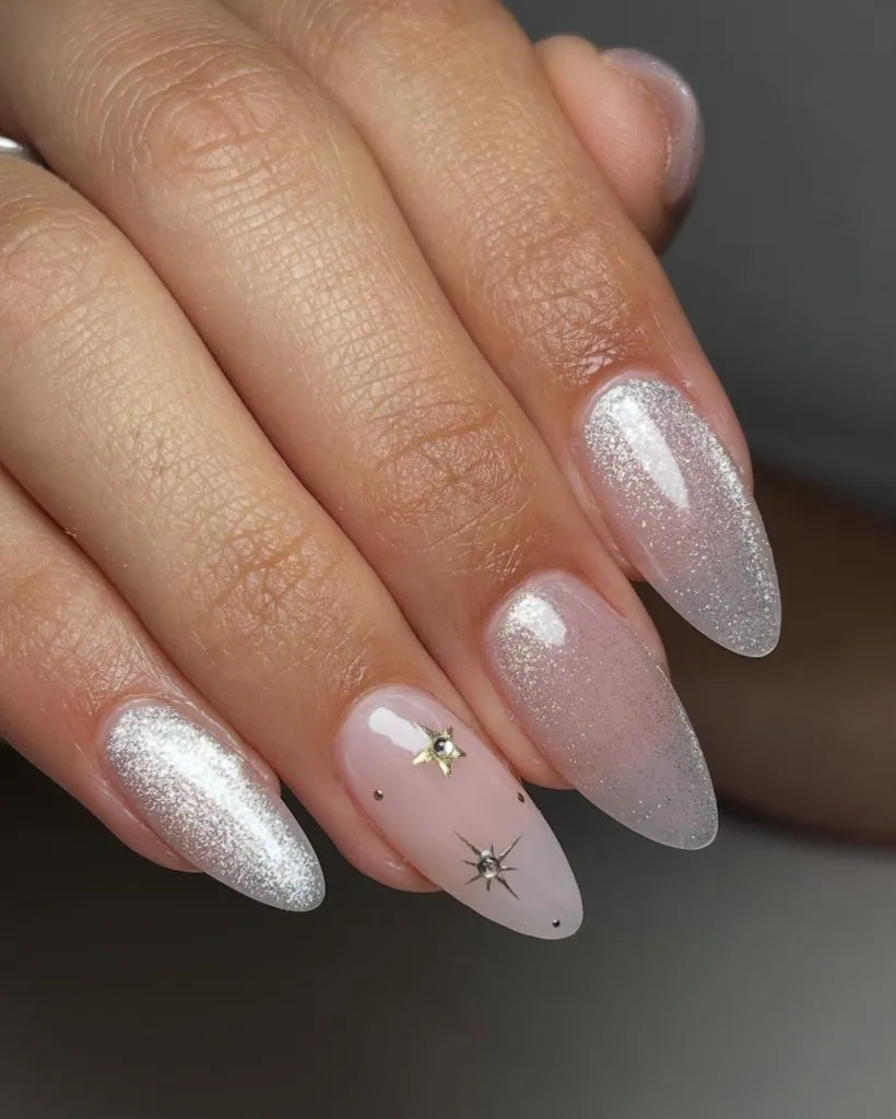 Here, fine silver shimmer meets a translucent pink base, creating a soft sparkling veil over each nail. And that tiny star accent? Just enough to make the set feel special and wedding-ready without going full glam.