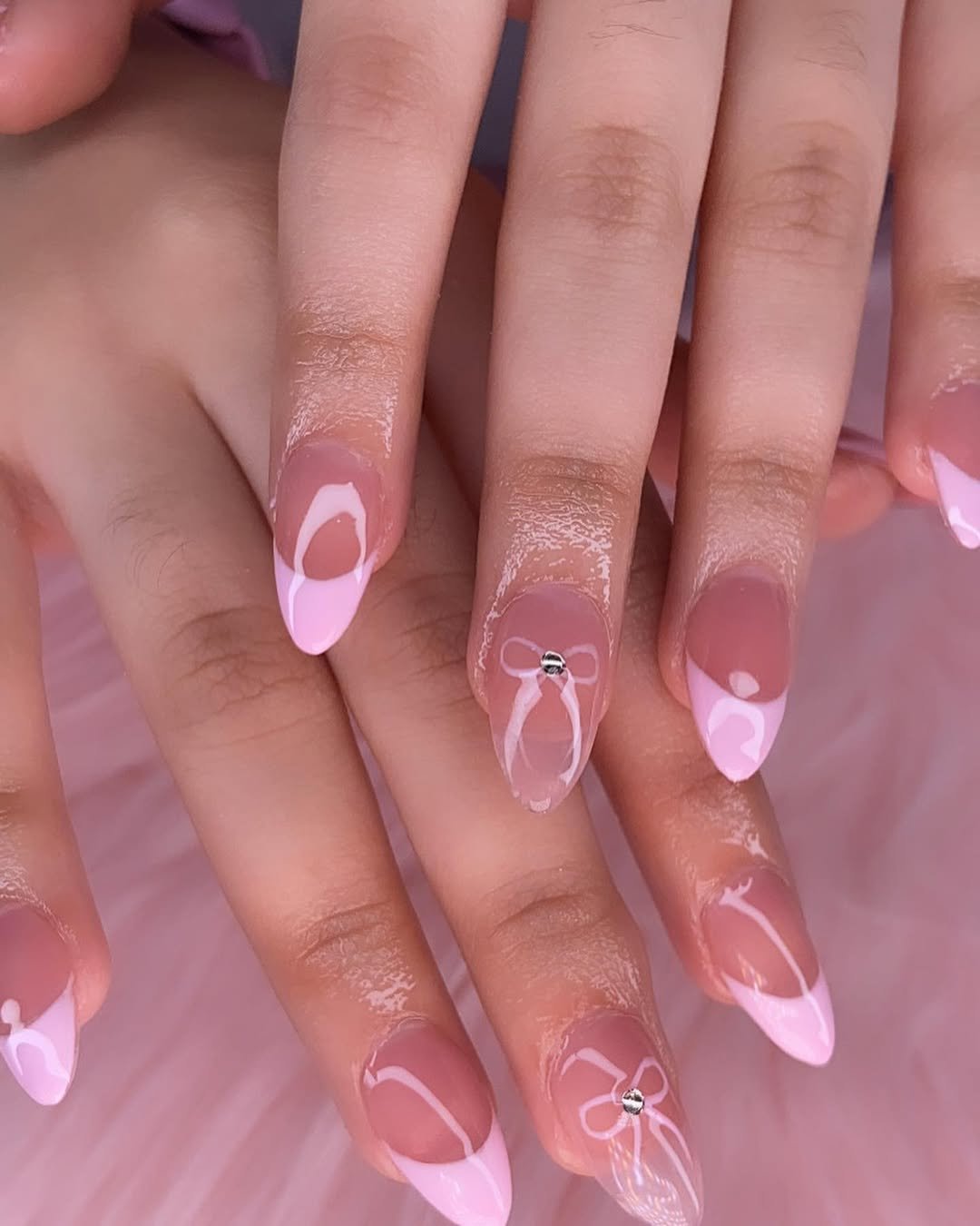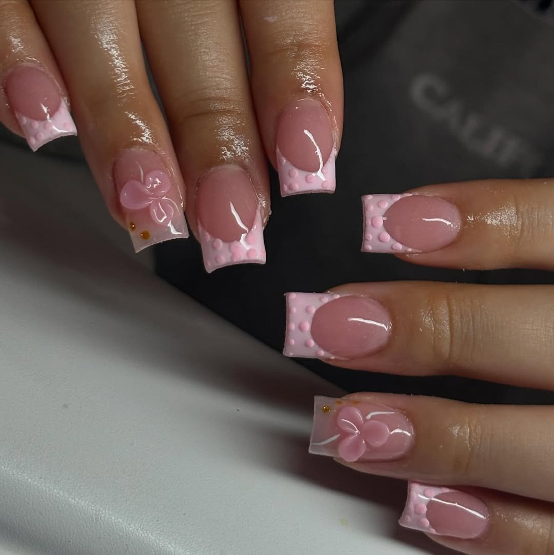 These nails lean into softness with fine pink tips and tiny bow details that feel almost hand-drawn. Nothing here is loud, everything feels intentional.
