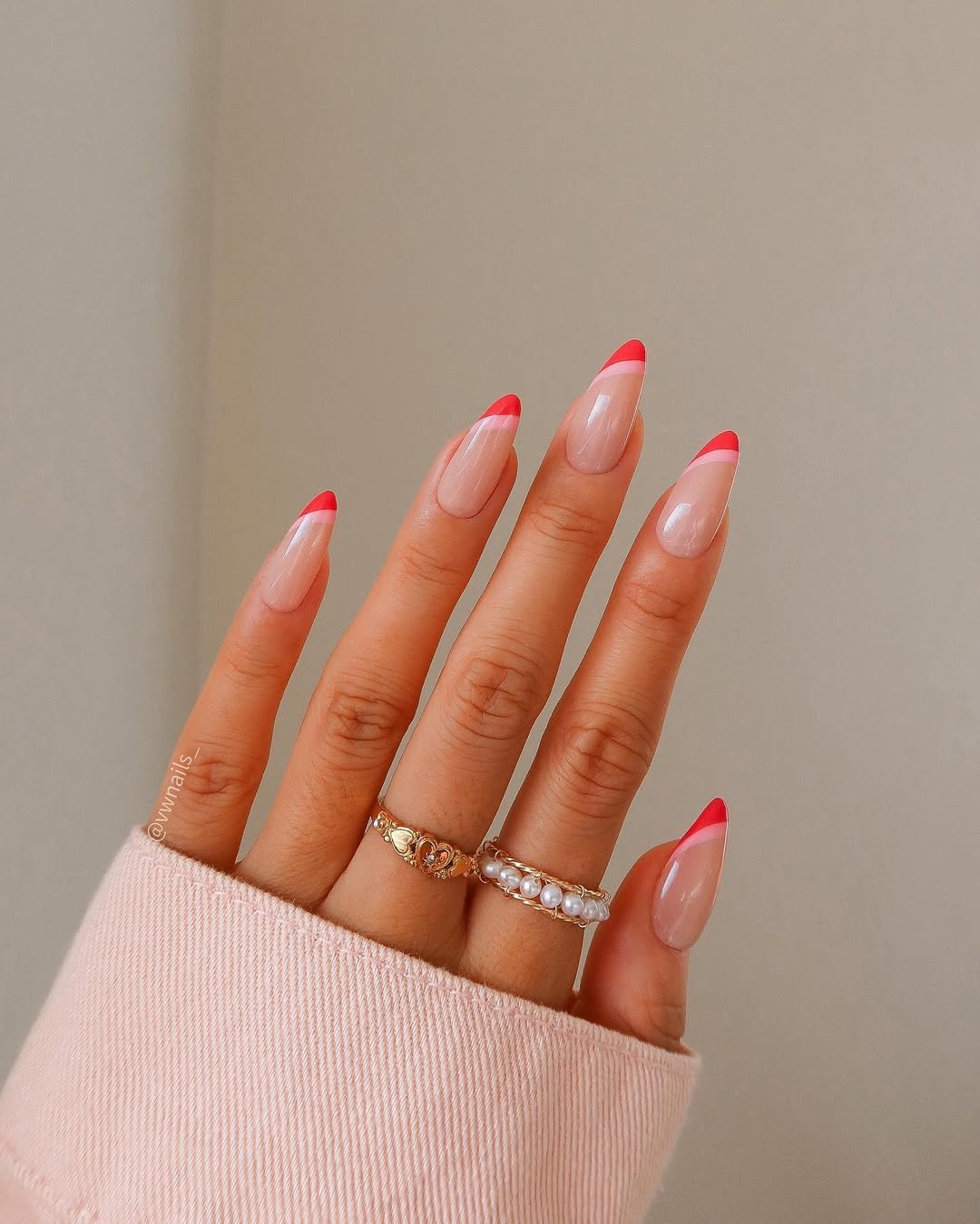 This look is all about clean lines and a confident pop of color. That coral-red French tip against a sheer nude base feels modern, crisp, and very wearable.