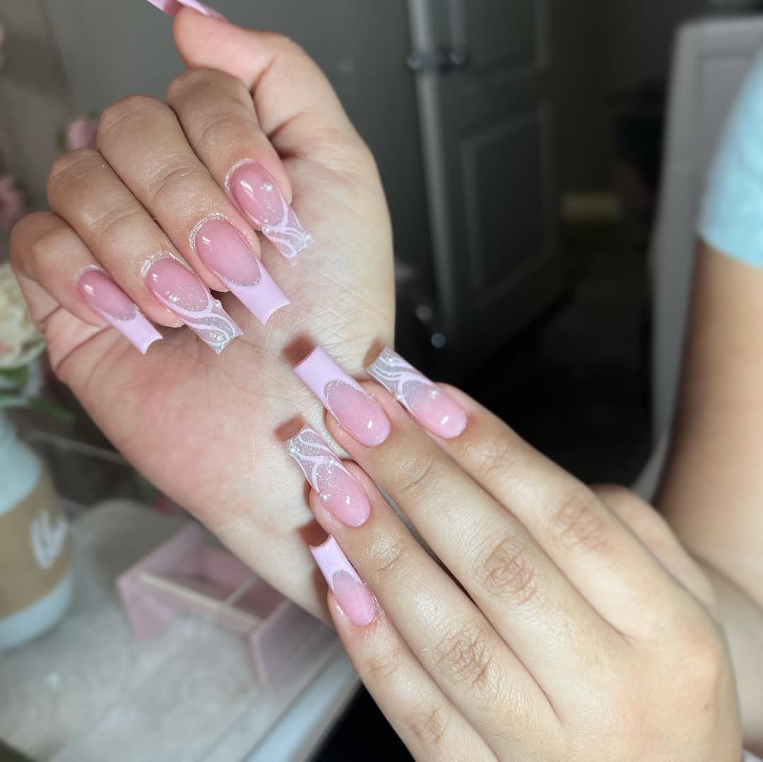 This set feels delicate in the best way. Pale pink tips paired with fine white lace-style detailing give the nails a soft, almost bridal mood without going full formal.