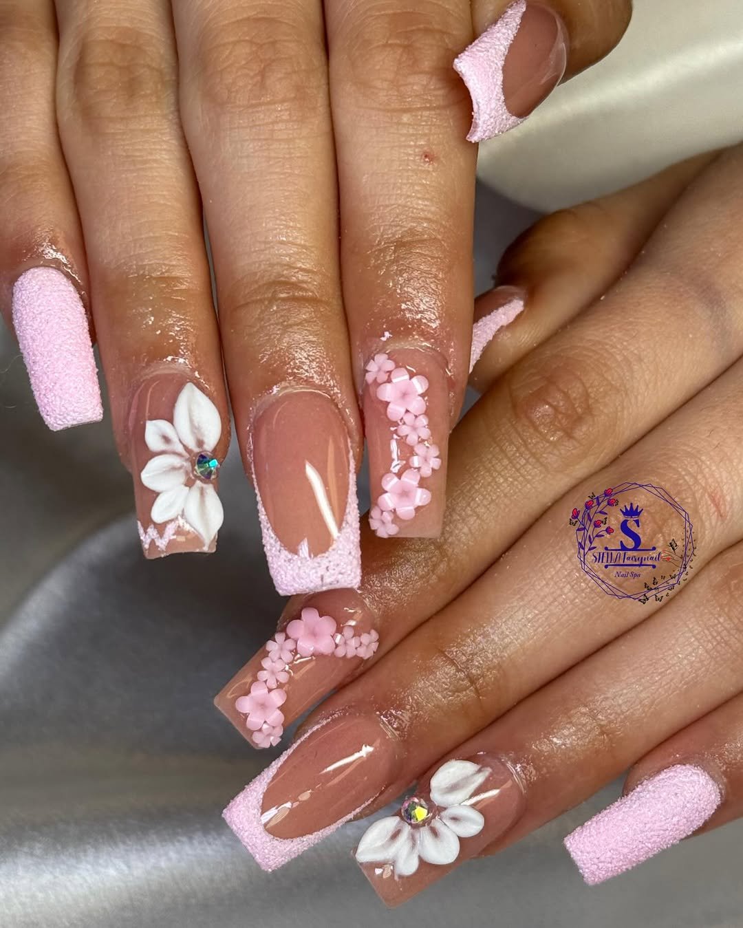 This set leans fully into romance. Soft blush bases meet sugar-textured pink tips, layered with sculpted florals that feel almost pastry-like in detail. The mix of matte texture and glossy nude keeps it from feeling too precious.