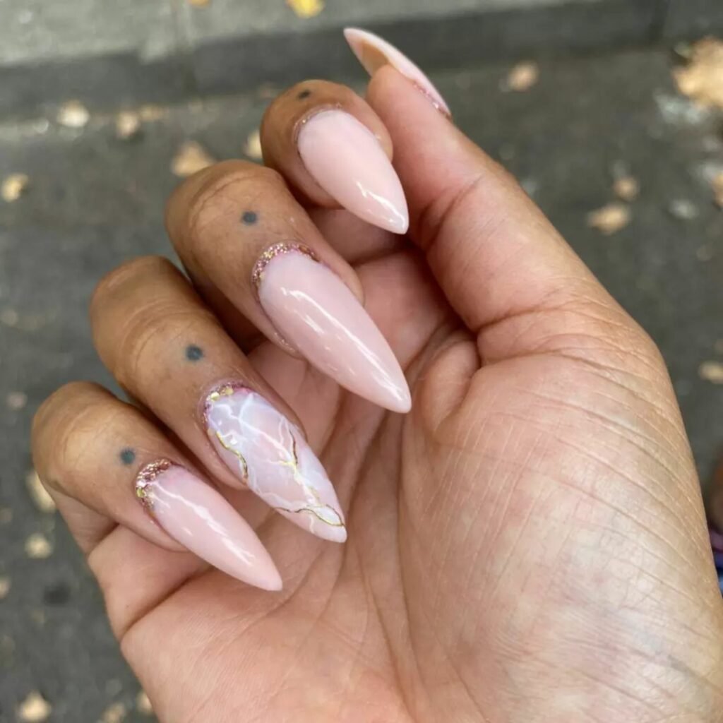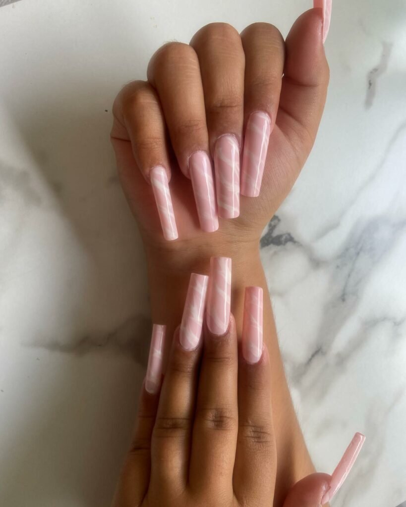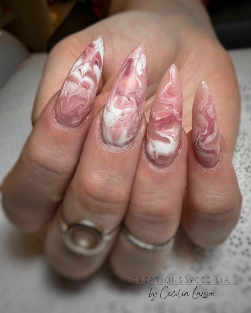 These sculpted, elongated nails are a full pink-marble fantasy — rich swirls, creamy hues, and intricate movement that makes each nail feel like a tiny canvas. The design feels luxurious, bold, and full of personality.