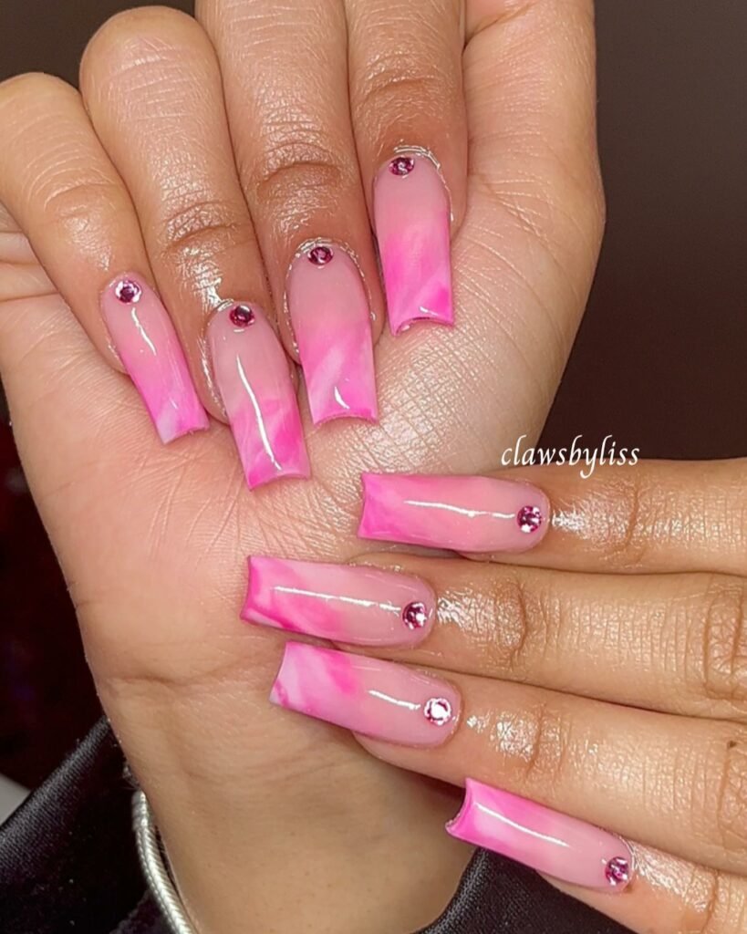 These glazed pink marble tips look like they were dipped in strawberry watercolor — soft, glossy, and kissed with tiny crystals that twinkle just enough. The long square shape gives them that modern, “I always have good lighting” elegance.