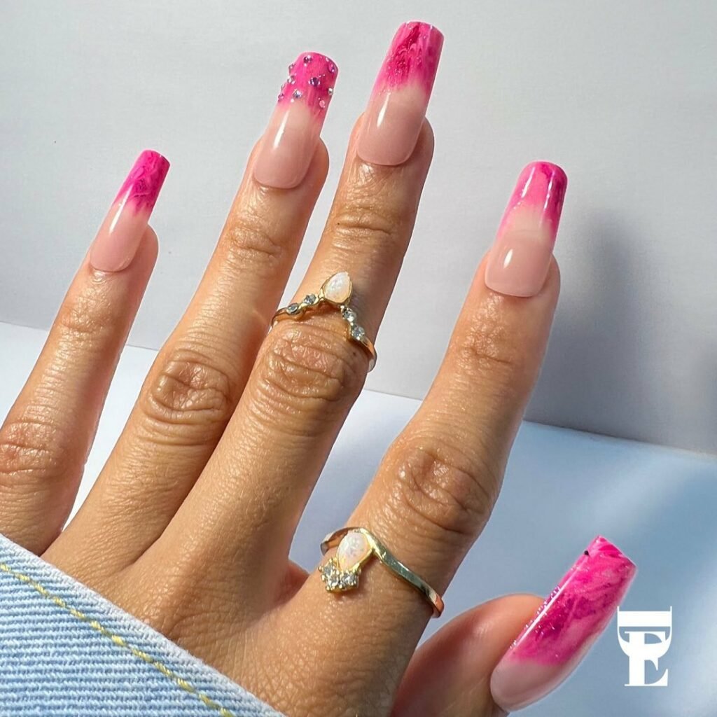 Baby pink meets vivid fuchsia in this glossy, high-shine design topped with tiny sparkling gems. The combination feels playful but polished, giving that “dollcore but make it classy” vibe.