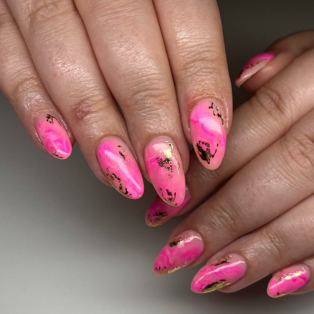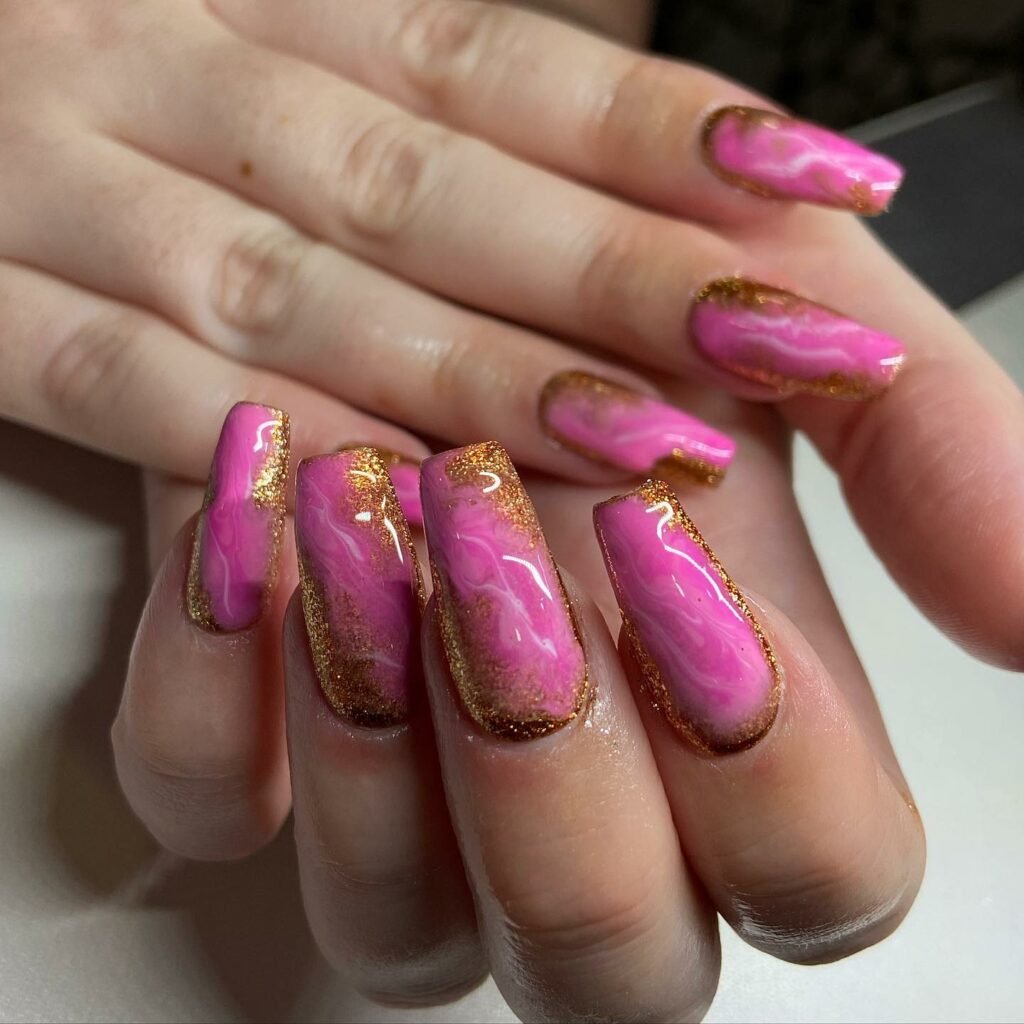These nails bring instant glam — hot pink marbling framed with molten gold edges that catch the light beautifully. The effect is bold yet luxurious, almost like pink lava flowing through a gold-lined frame.