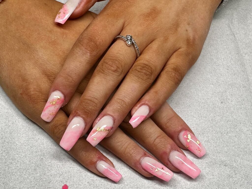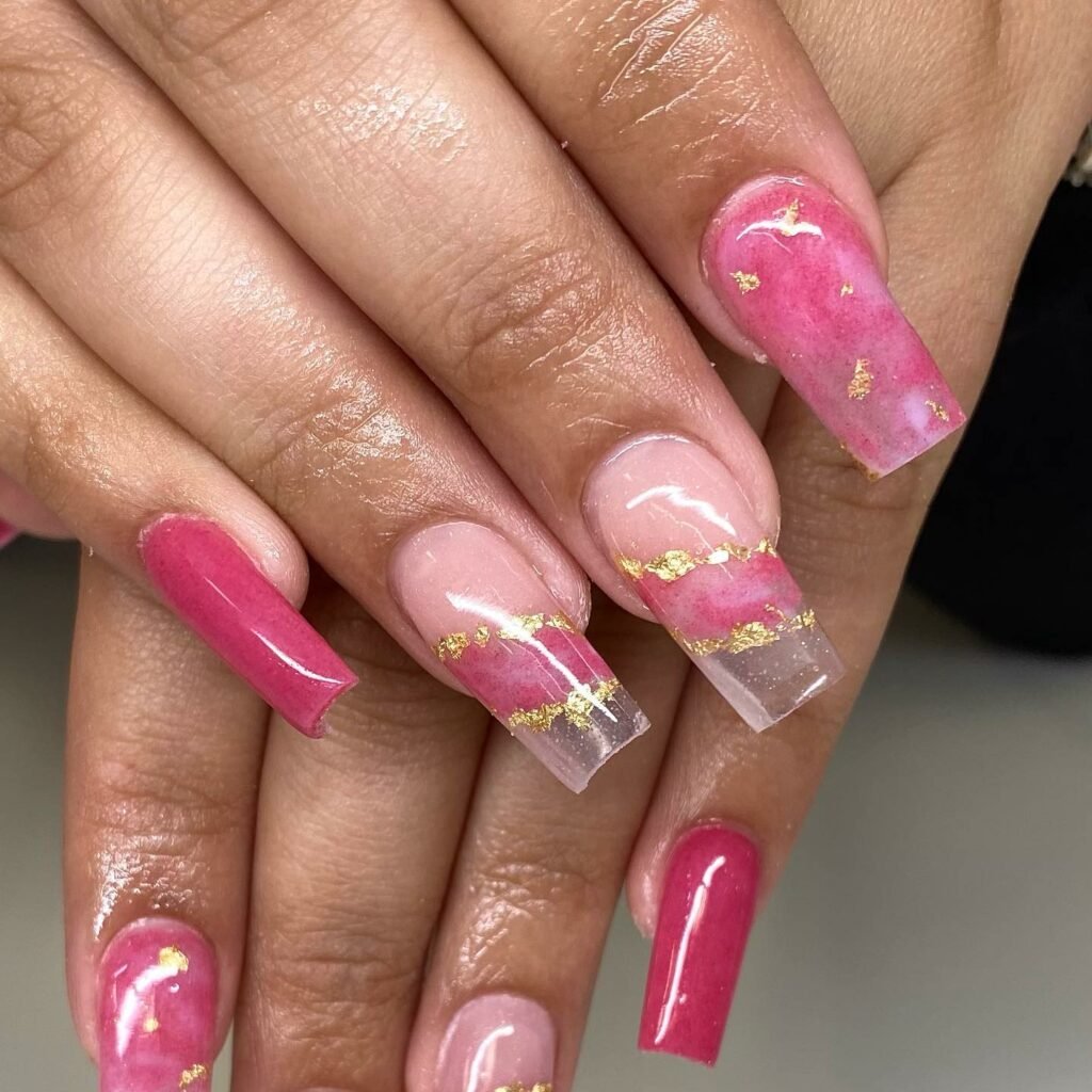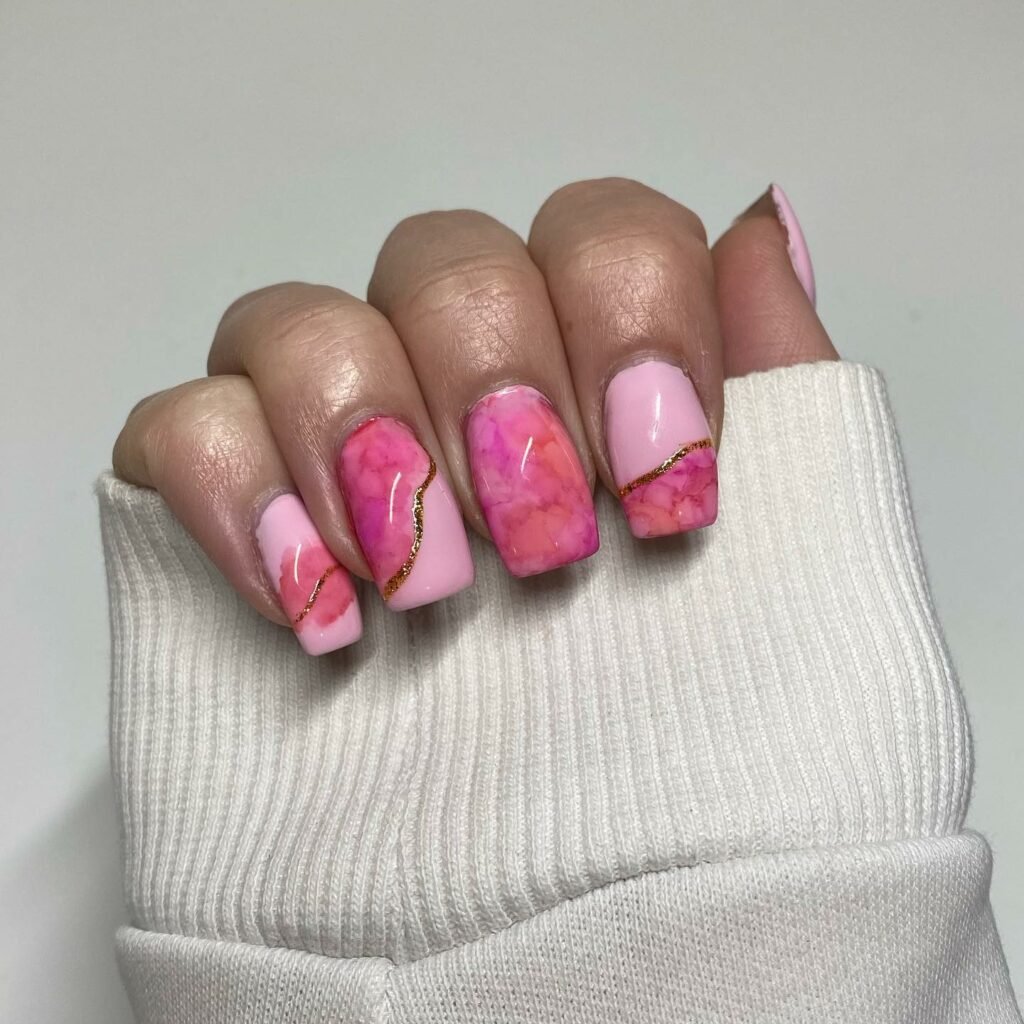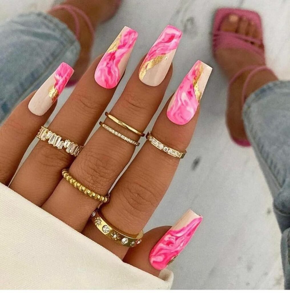 These nails are the definition of pretty-meets-polished — bold pink marbling drifting across creamy nude, with subtle gold accents for a touch of opulence. The long square shape makes the marbling feel even more dramatic and striking.